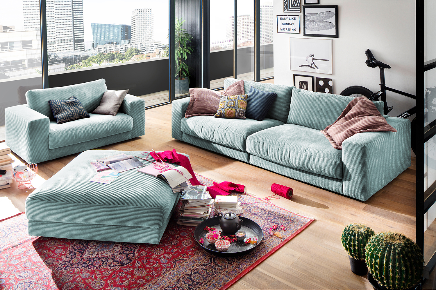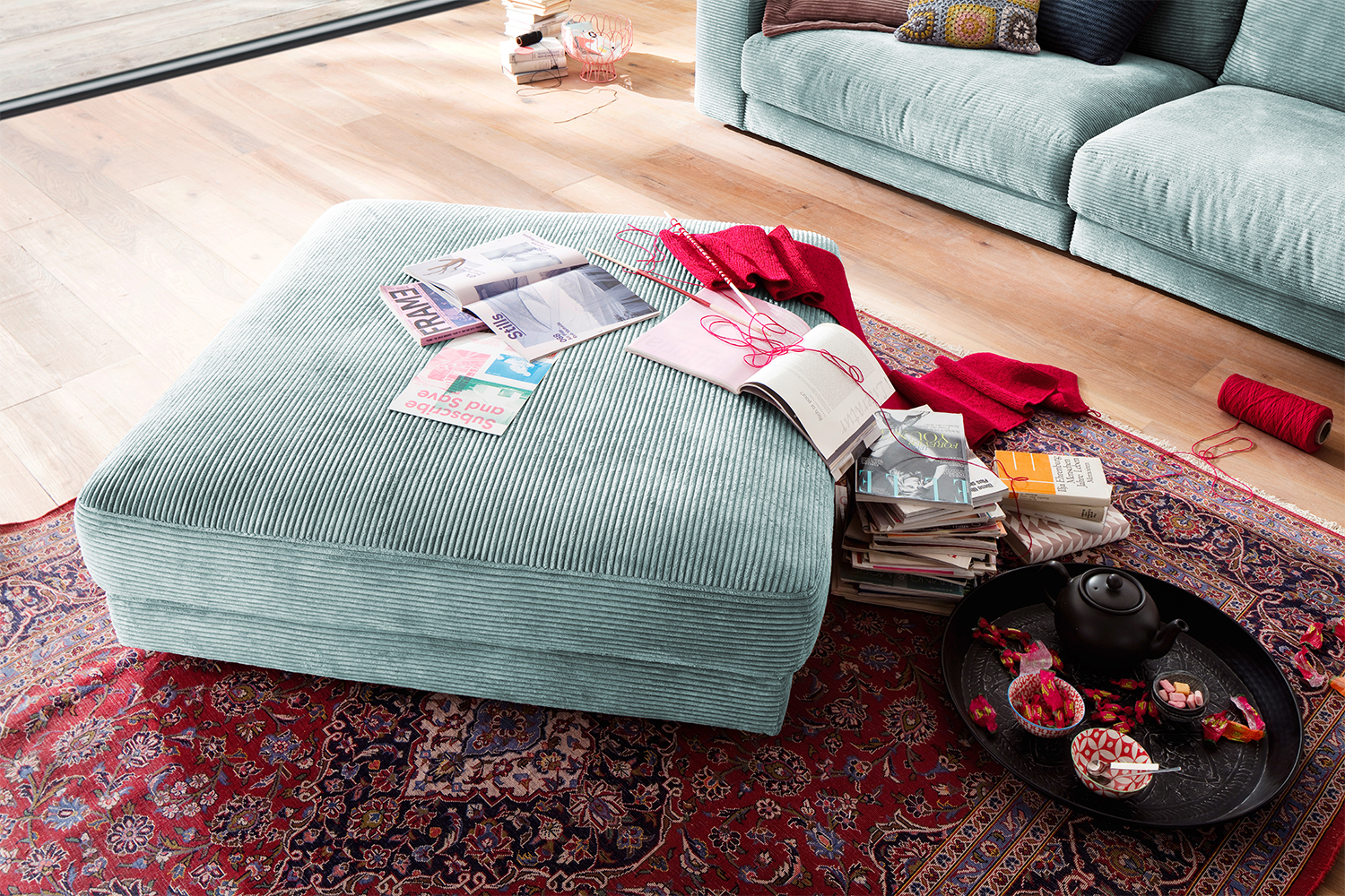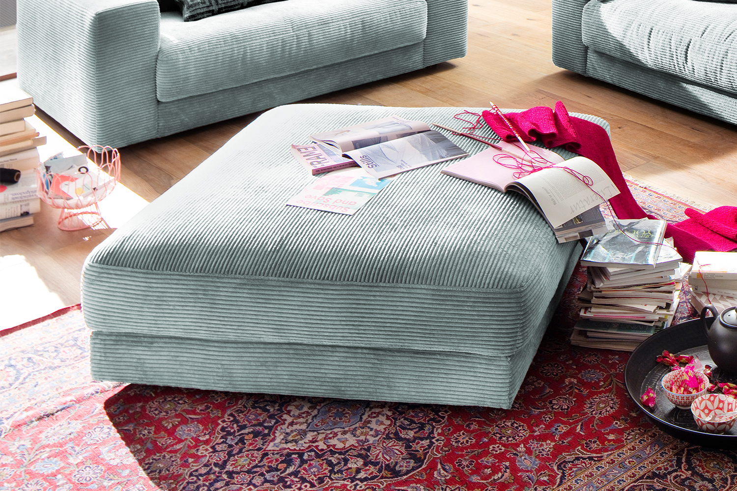 B-Ware KAWOLA Big Hocker MADELINE Polsterhocker Cord hellblau Der KAWOLA Big Hocker MADELINE besticht durch seinen hervorragenden Sitzkomfort, der durch die äußerst legere Polsterung zustande kommt und zum Verweilen und Entspannen einlädt. Seine moderne und urbane Form verleihen dem Polsterhocker sein unverwechselbares Aussehen. Mit seinem zeitlosen Design fügt es sich nahtlos in jede Umgebung ein und macht in jedem Interieur eine gute Figur. Wenn Sie Ihrem Wohnzimmer einen außergewöhnlichen Anstrich verleihen wollen, ist der Big Hocker MADELINE definitiv das Richtige für Sie! Der Hocker ist außerdem die perfekte Ergänzung zu den Cord-Sofas aus der Serie MADELINE.