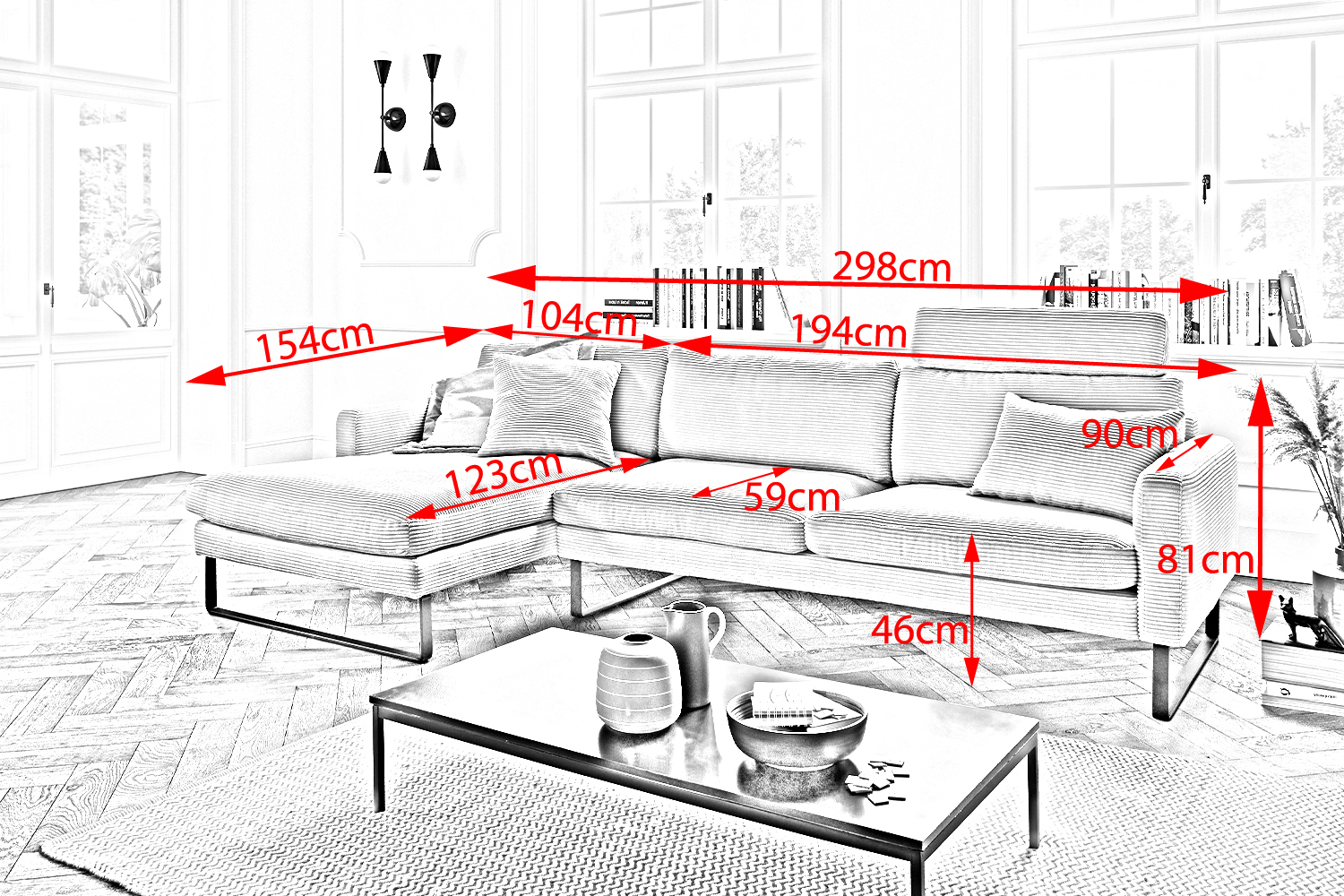 Das KAWOLA Ecksofa RICARDA verbindet klassisches Design mit sachlicher Modernität und fügt sich nahtlos in jedes Interieur ein. Seine weichen Formen und der Bezug aus angesagtem Cord-Stoff verleihen dem Sofa eine zeitlose Eleganz. Die komplexe Polsterung garantiert höchsten Sitzkomfort und passt sich durch ihren legeren Aufbau der Körperform an. Die losen Sitzkissen aus sind schichtweise aufgebaut und in verschiedenen Stärken und Härten aufeinander abgestimmt. Darüber hinaus ist das Sofa mit hochwertigen Kammerkissen ausgestattet. Um ein Stauchen des Füllmaterials zu verhindern, sollten diese Rückenkissen nach Gebrauch aufgeschüttelt werden. Unter den Sitzkissen befinden sich Klettbänder für einen besseren Halt. Kurz: Das Sofa RICARDA lässt keine Wünsche offen! Egal zu welcher Gelegenheit - hier findet jeder ein Plätzchen zum Entspannen...