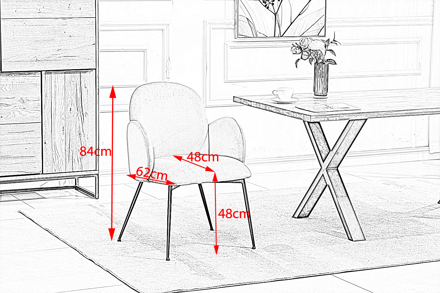 Neben seinem ansprechenden Design bietet der DEON Esszimmerstuhl herausragenden Sitzkomfort. Die geschwungenen Linien und gepolsterten Armlehnen unterstützen Ihre Körperhaltung, laden zu längeren Mahlzeiten und angeregten Gesprächen ein. Die pulverbeschichteten schwarzen Stahlbeine gewährleisten Stabilität und verleihen dem Stuhl eine moderne Ästhetik.