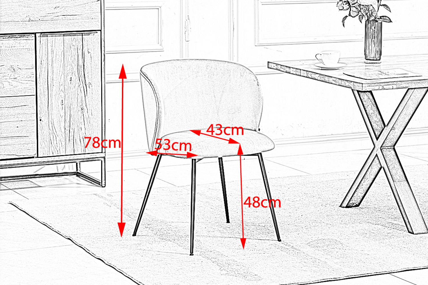 Mit präziser Maßarbeit beeindruckt der Stuhl durch ästhetisches Design. Abmessungen von 53 cm Breite, 53 cm Tiefe und 78 cm Höhe passen ideal zu verschiedenen Tischhöhen. Sitzhöhe von 48 cm und Sitztiefe von 43 cm bieten angenehmen Komfort und unterstützen eine aufrechte Haltung.