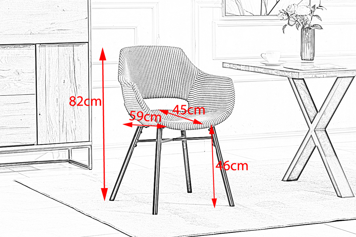 Der Cordstoff ist nicht nur optisch ansprechend, sondern auch besonders pflegeleicht. Kleine Verschmutzungen lassen sich einfach entfernen, sodass der Esszimmerstuhl lange wie neu aussieht. Die ergonomische Form und die angenehme Polsterung bieten auch bei längerem Sitzen hohen Komfort.