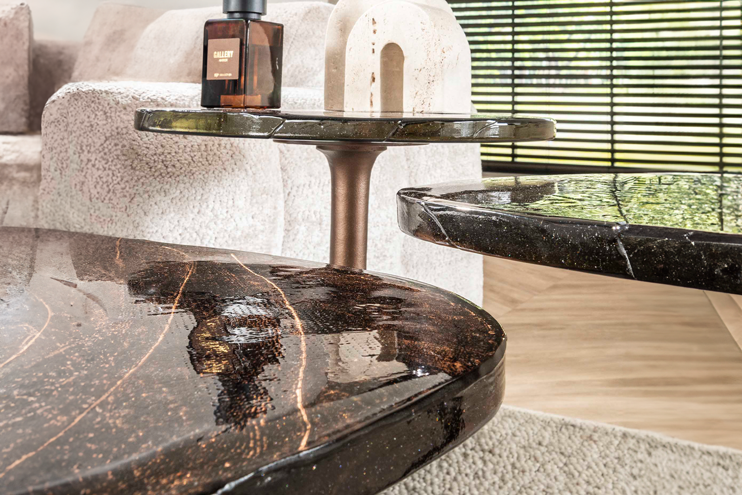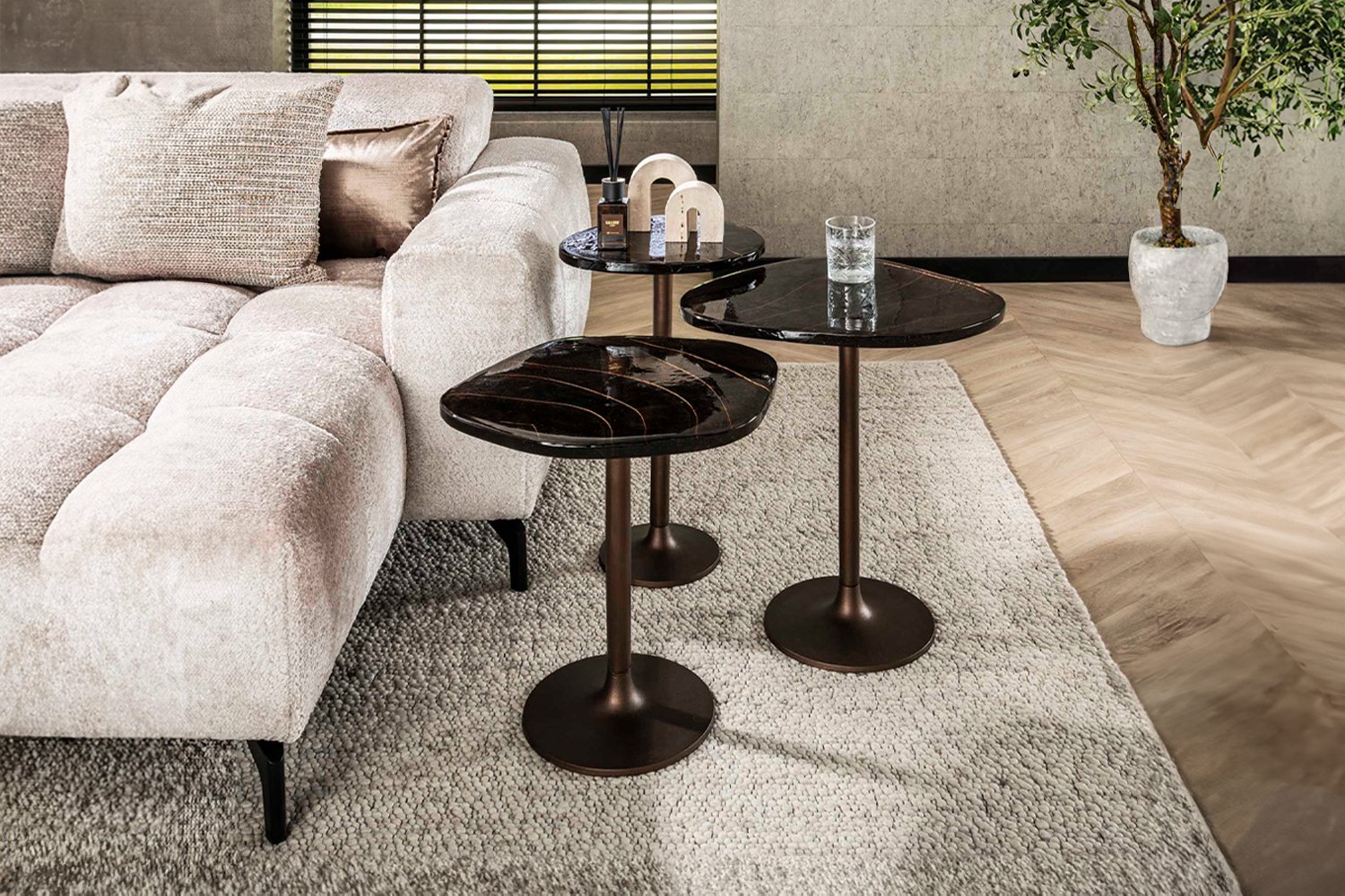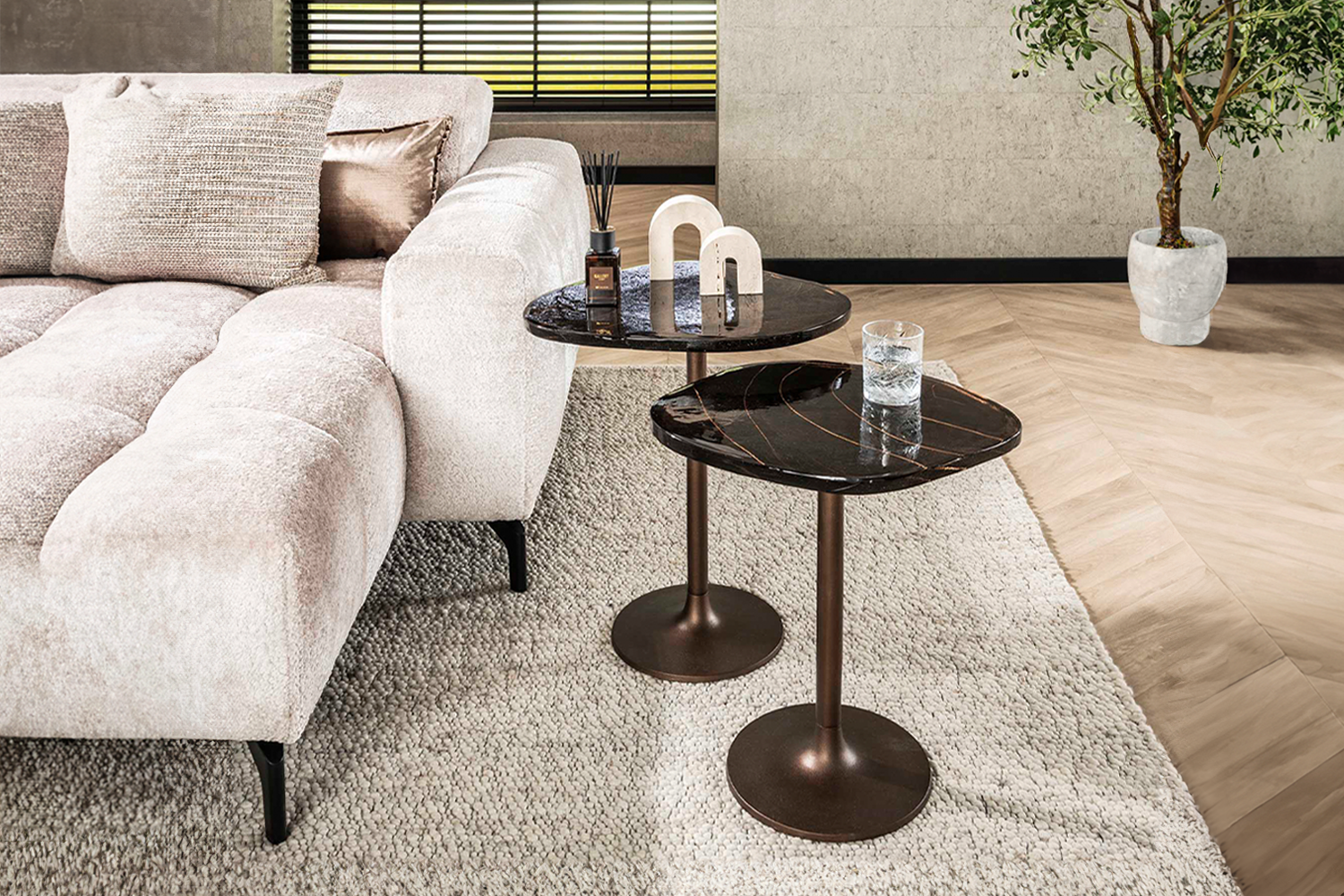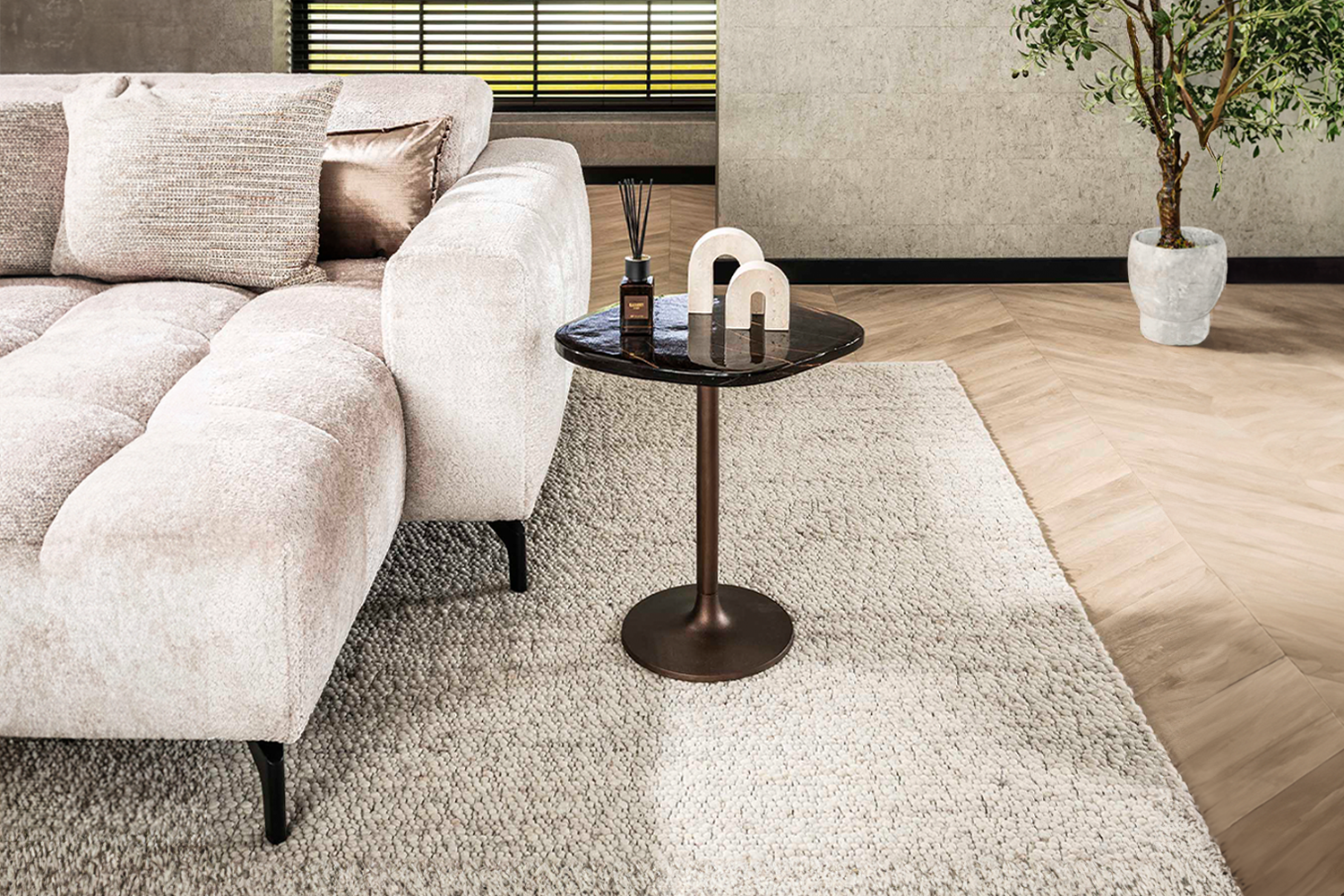 Der Beistelltisch DARI S von KAWOLA bringt Eleganz und Charakter in jeden Wohnraum. Die runde Glasplatte aus gezogenem Glas überzeugt mit einer feinen, sanft gewellten Oberfläche, die das Licht auf charmante Weise reflektiert. Die kleinen Unregelmäßigkeiten der Glasstruktur verleihen jedem Tisch eine individuelle Note und machen ihn zu einem besonderen Einzelstück. Das schlanke Metallgestell in warmem Antikkupfer rundet das Design harmonisch ab und sorgt für einen edlen, zeitlosen Look. Mit seiner kompakten Größe ist DARI die perfekte Lösung für kleinere Wohnbereiche oder als dezenter Begleiter neben Sofa oder Sessel. Er bietet eine stilvolle Ablagefläche für Getränke, Bücher oder Dekorationen und lässt sich dank seines minimalistischen Designs mühelos in jede Einrichtung integrieren. Ob als einzelner Blickfang oder als Ergänzung zu weiteren Akzentmöbeln – DARI sorgt immer für eine elegante, moderne Note.