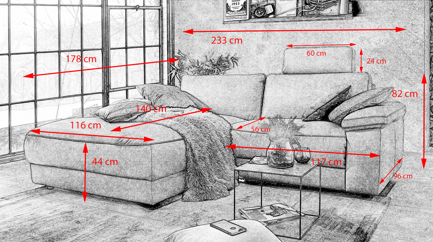 Kopfstütze: Höhe: 24 cm Breite: 60 cm Tiefe: 15 cm Gesamthöhe Sofa mit Kopfstütze: 106 cm