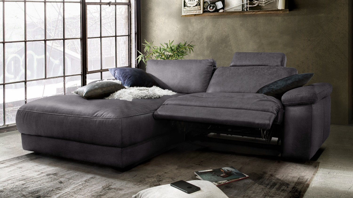 Produktinformationen "KAWOLA Sofa LOLA Ecksofa Stoff schwarz mit motorischer Relaxfunktion"
