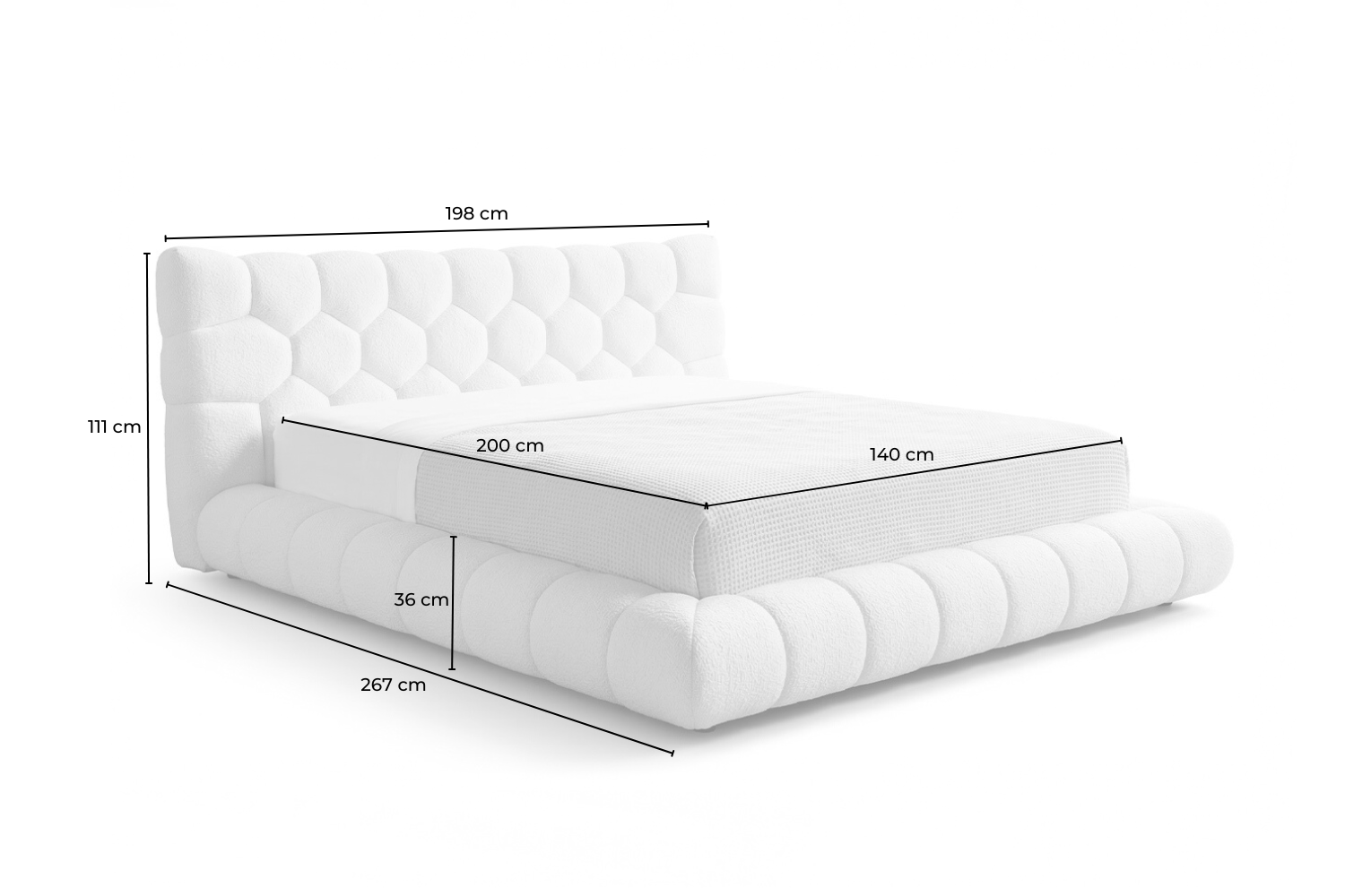 Ein besonderes Highlight ist der hochwertige Bezug aus Bouclé-Stoff. Bouclé zeichnet sich durch seine typische, leicht unregelmäßige Schlingenstruktur aus, die dem Material eine lebendige, dreidimensionale Oberfläche verleiht. Die feine Textur wirkt nicht nur optisch spannend, sondern sorgt auch für eine angenehm weiche und warme Haptik. Bouclé steht für modernen Wohnkomfort, vermittelt Behaglichkeit und bringt gleichzeitig einen Hauch von Design-Statement in den Raum. Durch seine dichte Struktur ist der Stoff zudem strapazierfähig und bestens für den täglichen Gebrauch geeignet. Auch die Rückseite des Kopfteils ist vollständig mit dem gleichen Bouclé-Stoff bezogen, wodurch das Bett frei im Raum platziert werden kann und aus jeder Perspektive eine hochwertige Erscheinung bietet.