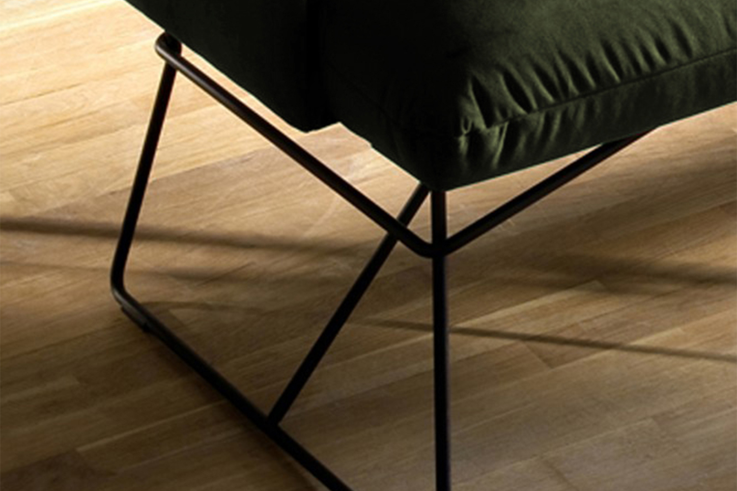 Durch den legeren Sitzaufbau ist eine modellbedingte und gestalterisch gewünschte Wellenbildung warentypisch und unterstreicht den gemütlichen Faktor der Sitzbank. Die behagliche Polsterung wird durch den samtigen Velvet-Bezug noch einmal zusätzlich unterstrichen, sodass auch die Haptik der Bank gemütlich und kuschelig erscheint.