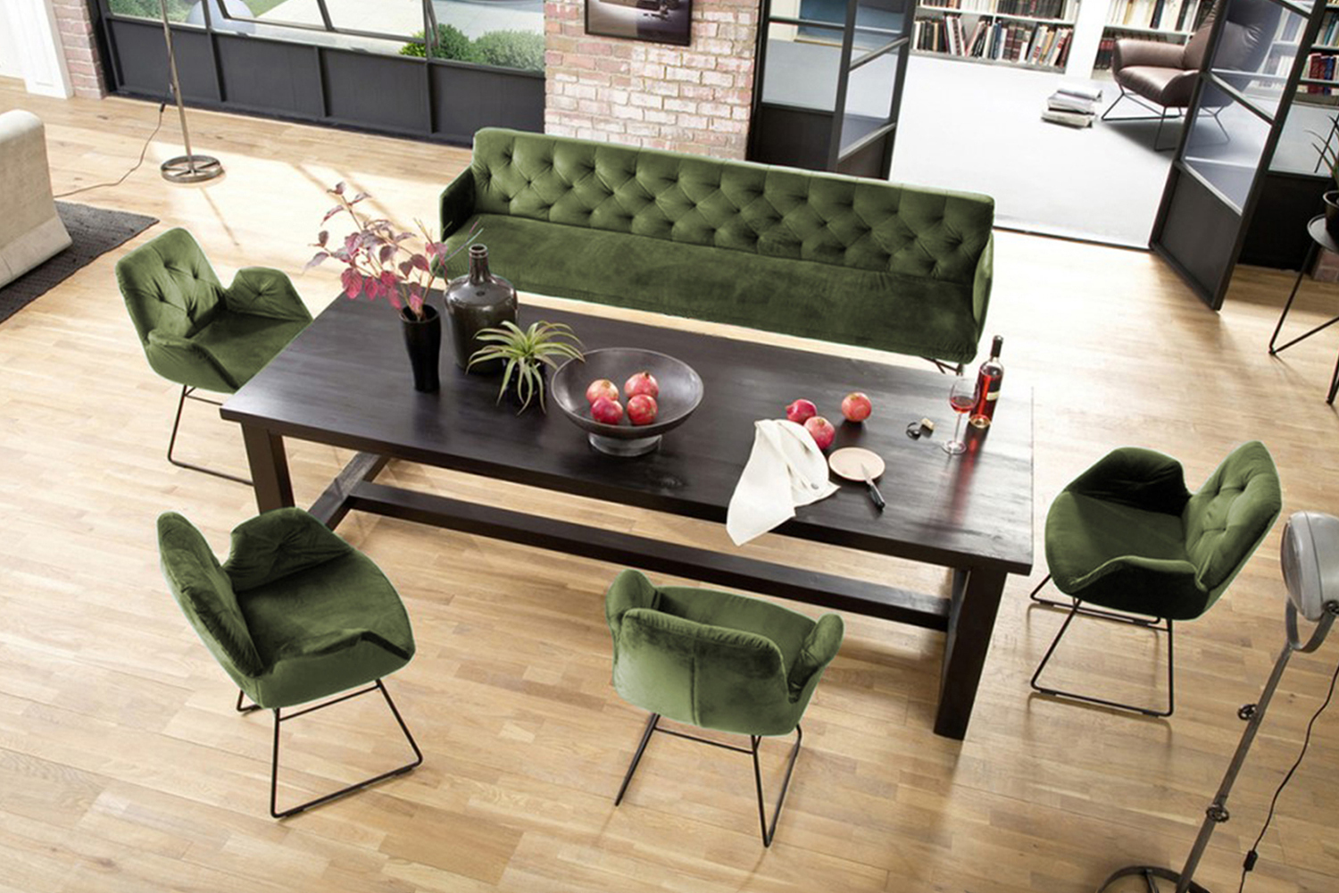 Die KAWOLA Esszimmerbank CHARME in der Farbe Velvet Oliv bringt Vintage-Feeling in jeden Raum.