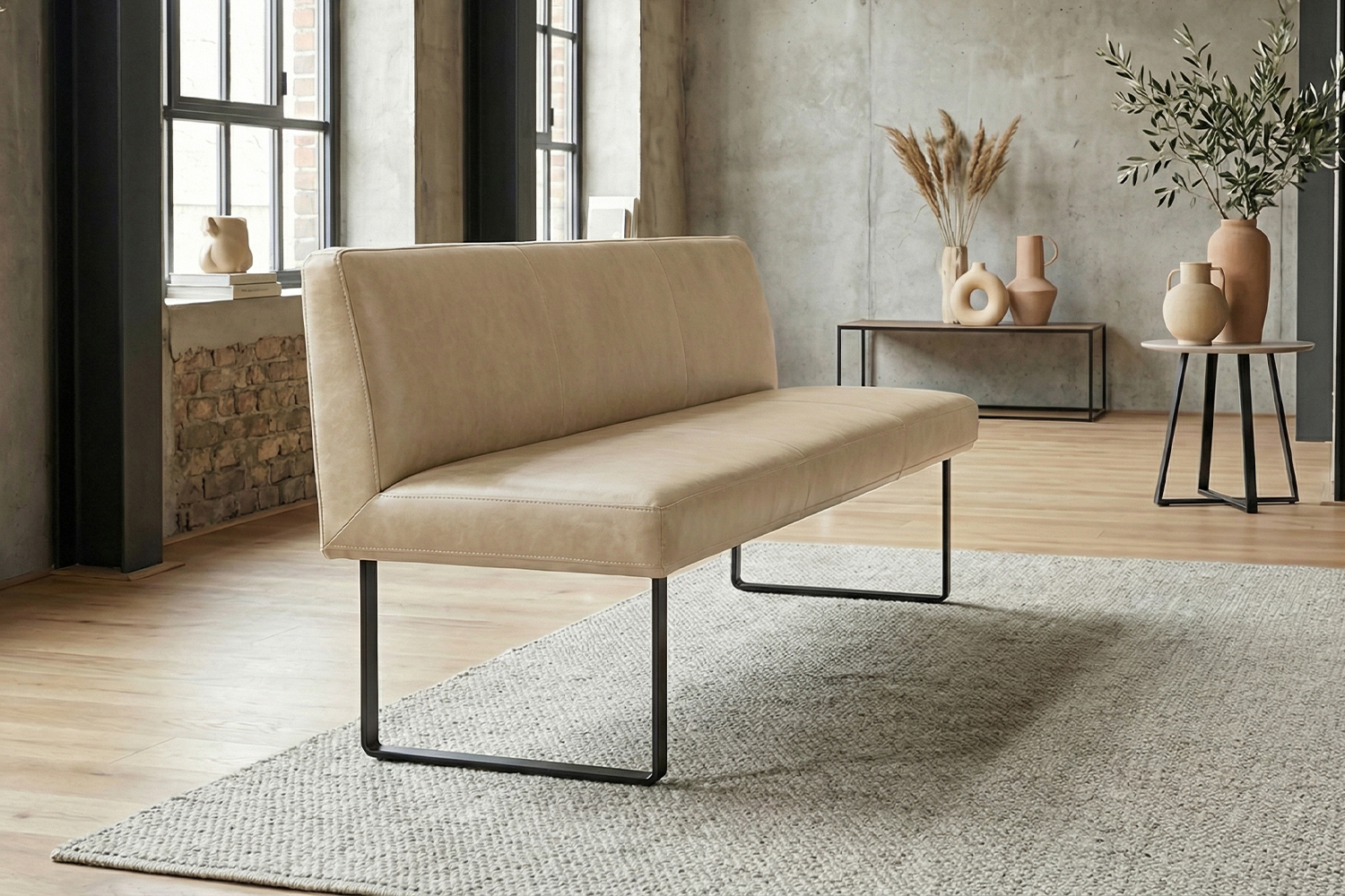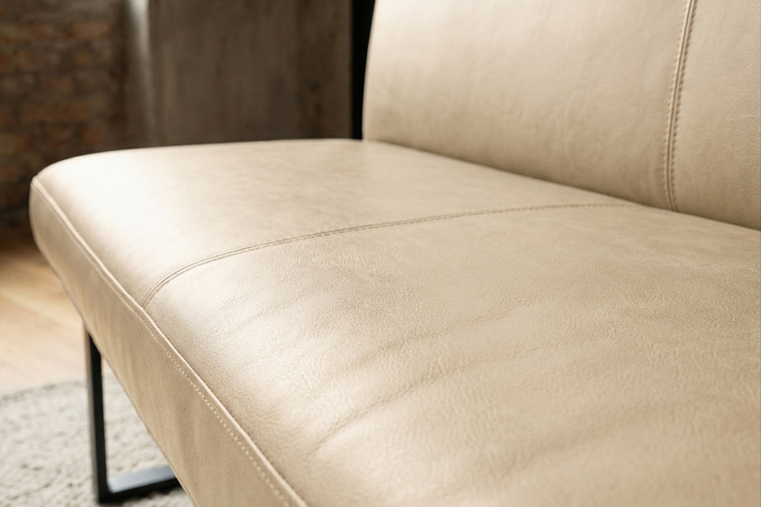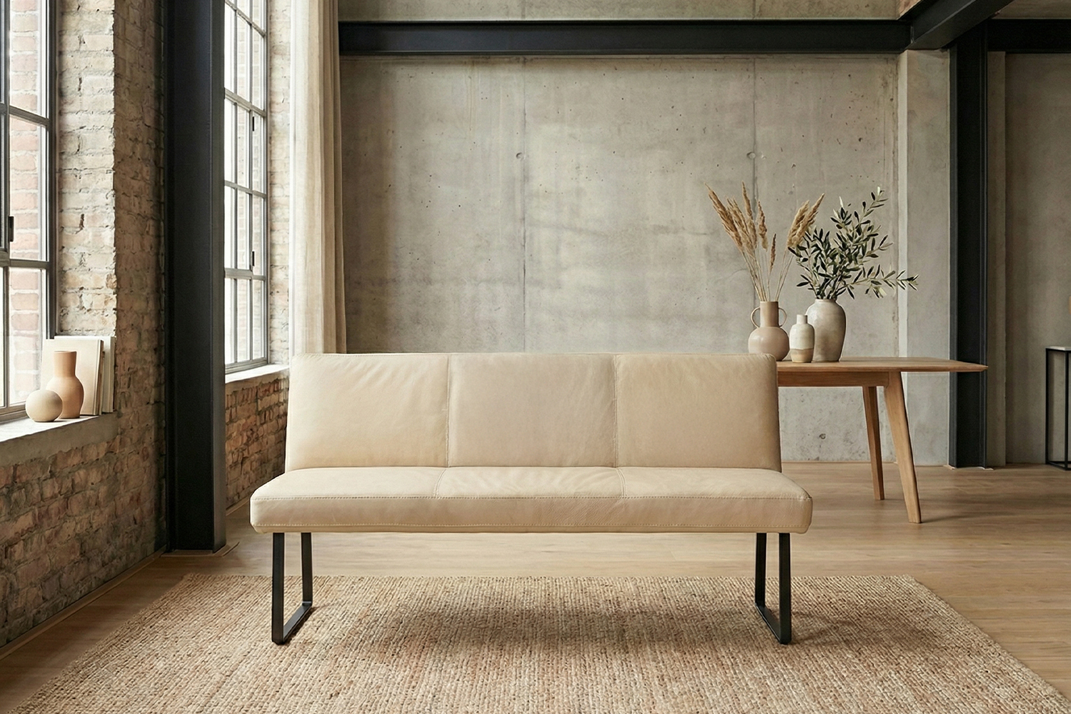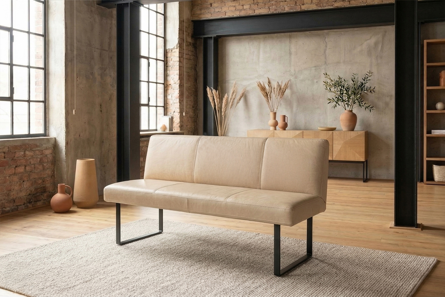 Das filigrane Gestell aus matt schwarzem Metall sorgt für einen sicheren Stand und unterstreicht den modernen Charakter der Bank. Im Inneren garantiert ein stabiler Massivholzrahmen langlebige Qualität und hohe Belastbarkeit. Für exzellenten Sitzkomfort ist ELEEN mit einem hochwertigen Sitzaufbau ausgestattet: PUR-Schaum in Kombination mit einem punktelastischen Tonnentaschenfederkernsitz mit gezogenem Federstahldraht sorgt für optimale Druckverteilung und komfortables Sitzen – auch über längere Zeit hinweg.