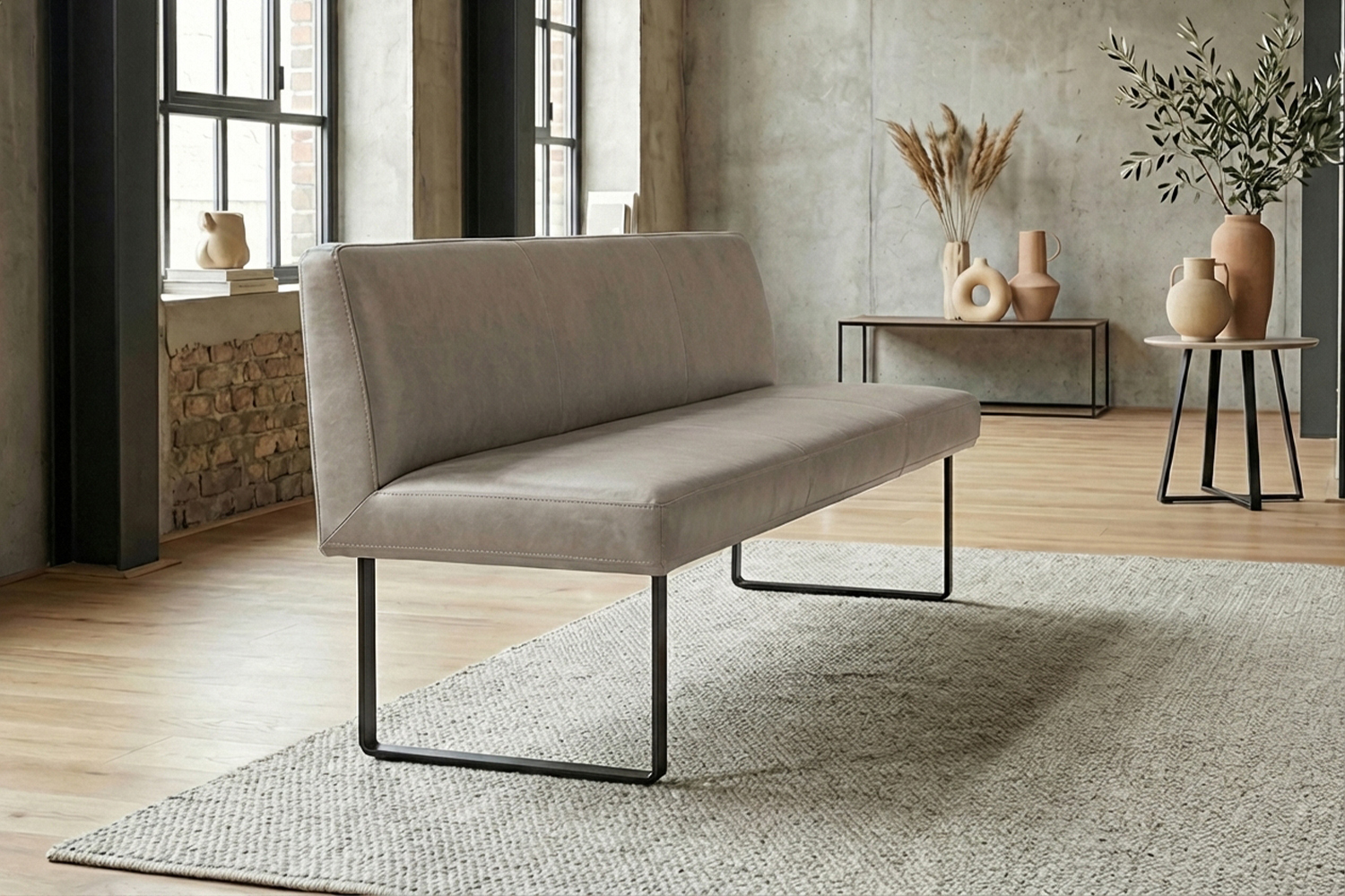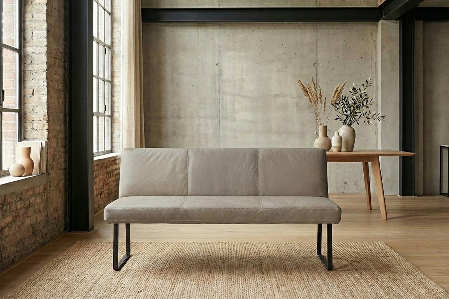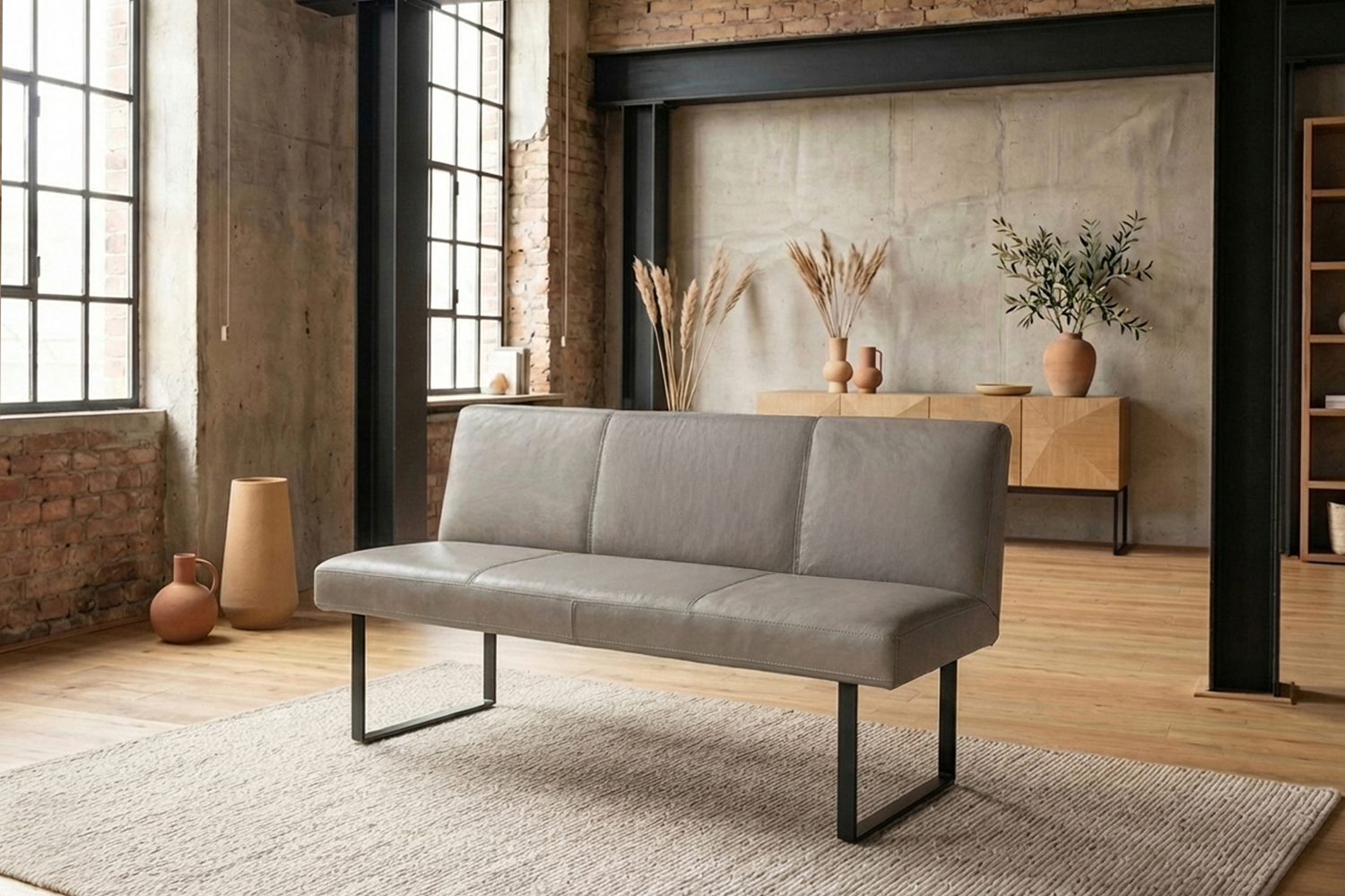 Das filigrane Gestell aus matt schwarzem Metall sorgt für einen sicheren Stand und unterstreicht den modernen Charakter der Bank. Im Inneren garantiert ein stabiler Massivholzrahmen langlebige Qualität und hohe Belastbarkeit. Für exzellenten Sitzkomfort ist ELEEN mit einem hochwertigen Sitzaufbau ausgestattet: PUR-Schaum in Kombination mit einem punktelastischen Tonnentaschenfederkernsitz mit gezogenem Federstahldraht sorgt für optimale Druckverteilung und komfortables Sitzen – auch über längere Zeit hinweg.