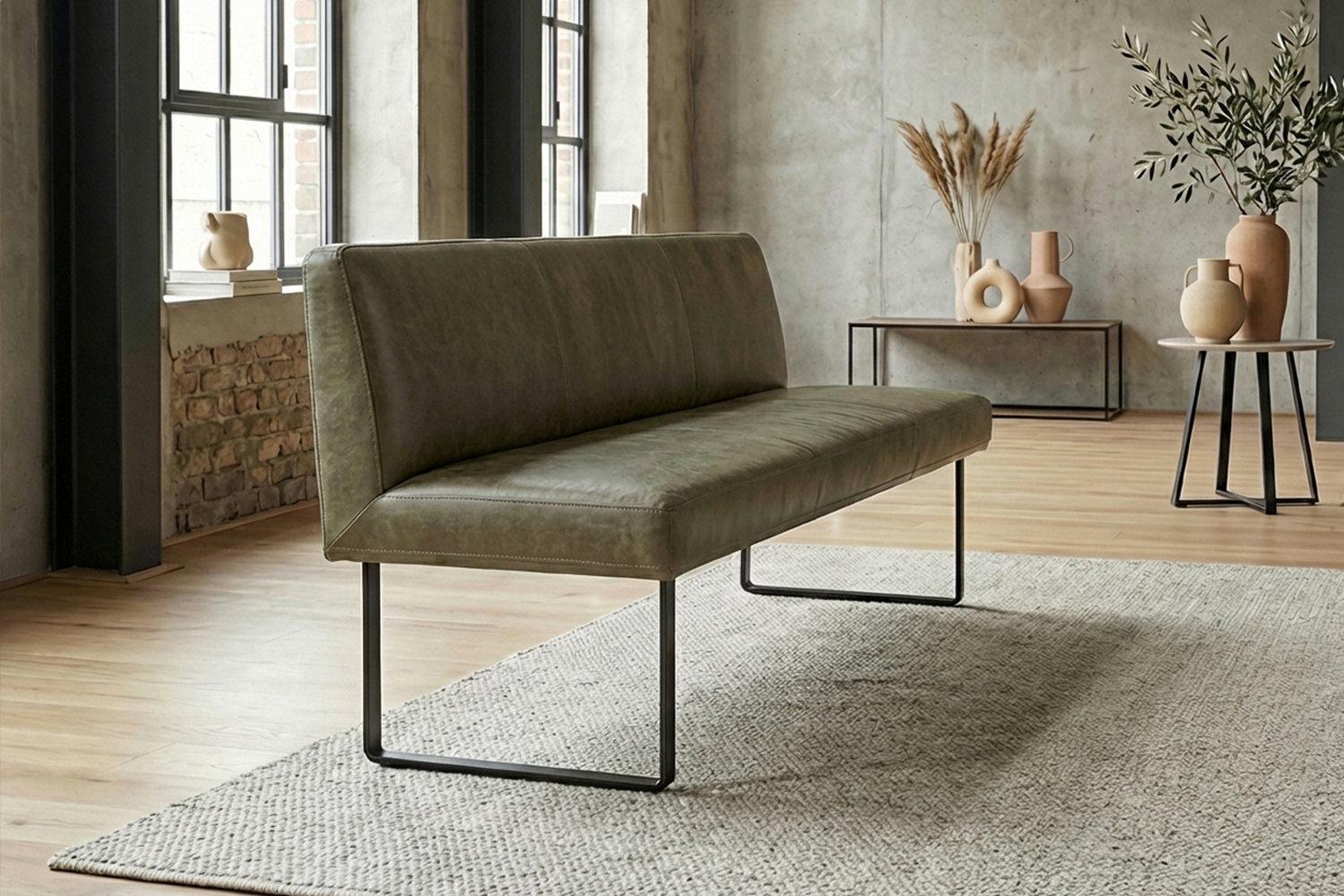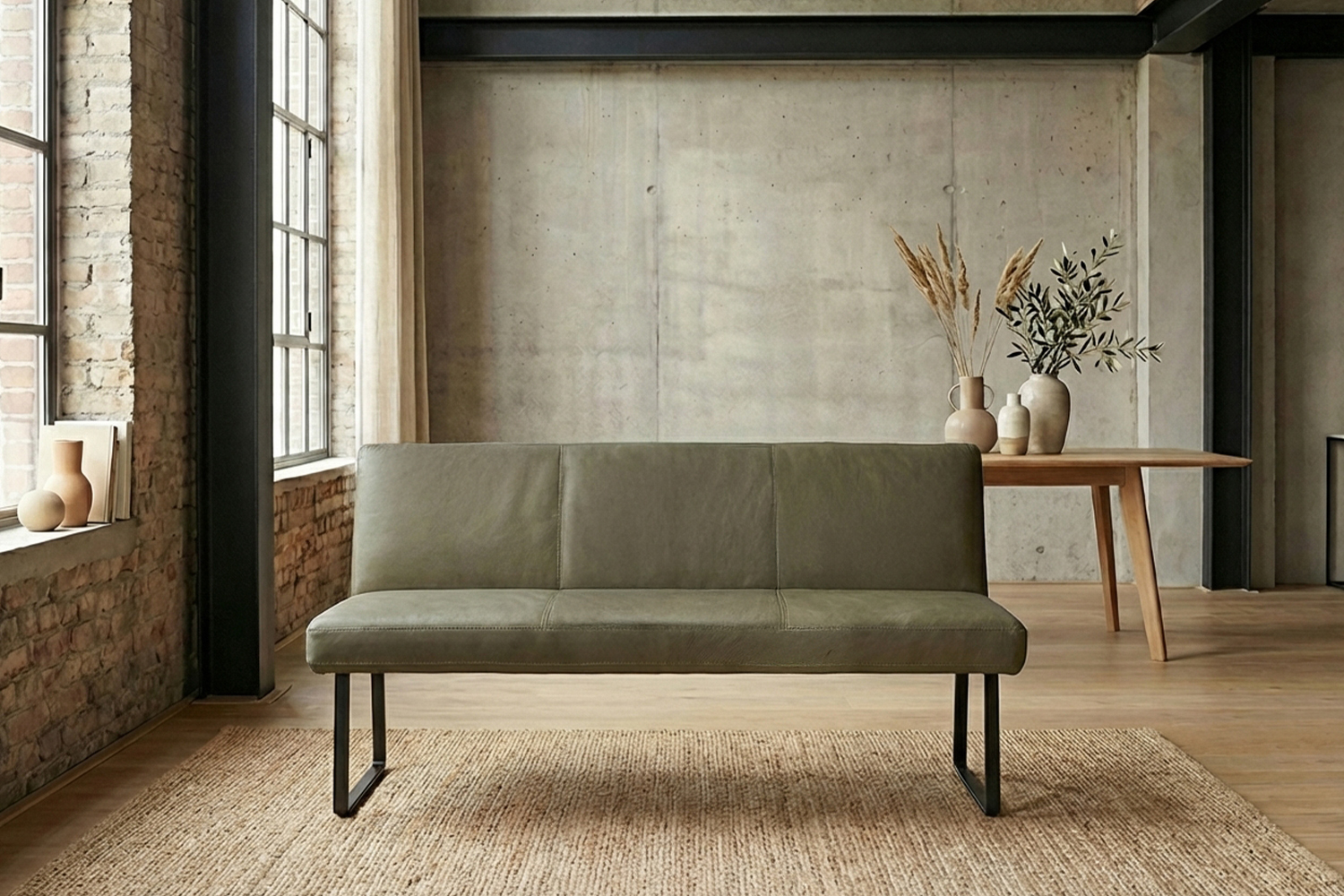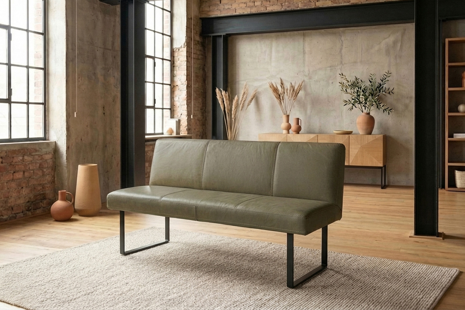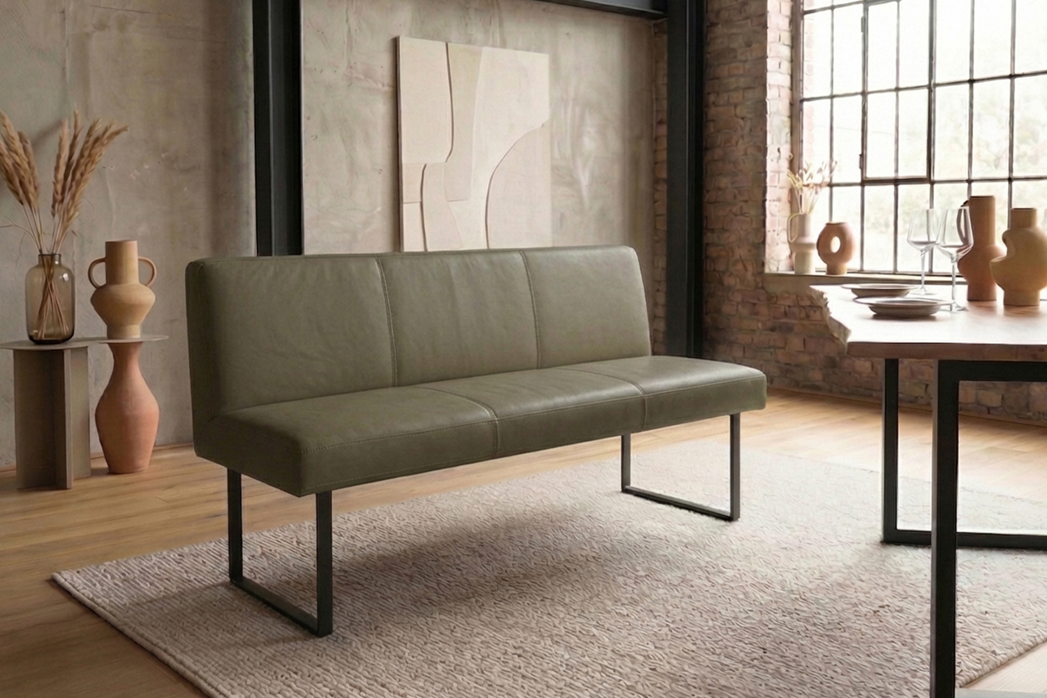Das filigrane Gestell aus matt schwarzem Metall sorgt für einen sicheren Stand und unterstreicht den modernen Charakter der Bank. Im Inneren garantiert ein stabiler Massivholzrahmen langlebige Qualität und hohe Belastbarkeit. Für exzellenten Sitzkomfort ist ELEEN mit einem hochwertigen Sitzaufbau ausgestattet: PUR-Schaum in Kombination mit einem punktelastischen Tonnentaschenfederkernsitz mit gezogenem Federstahldraht sorgt für optimale Druckverteilung und komfortables Sitzen – auch über längere Zeit hinweg.