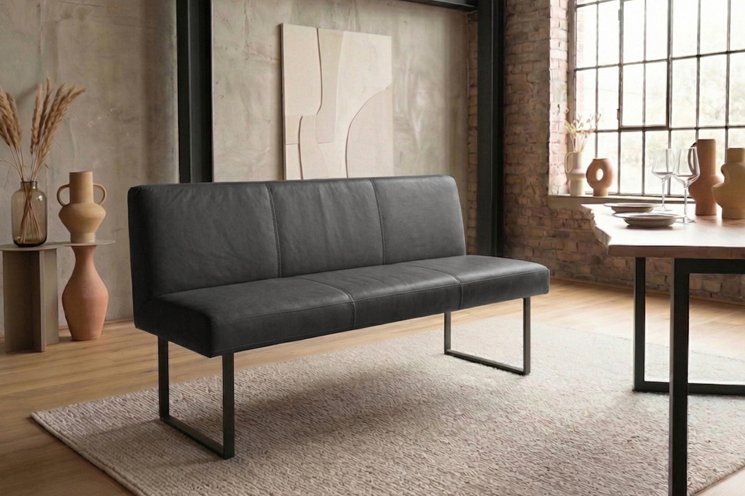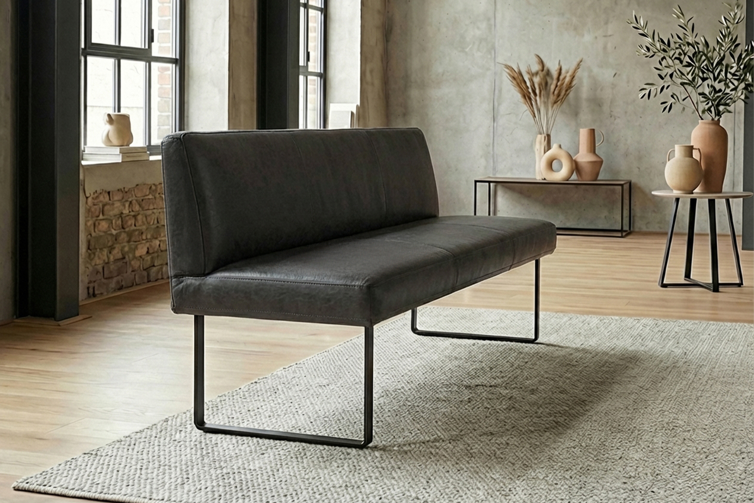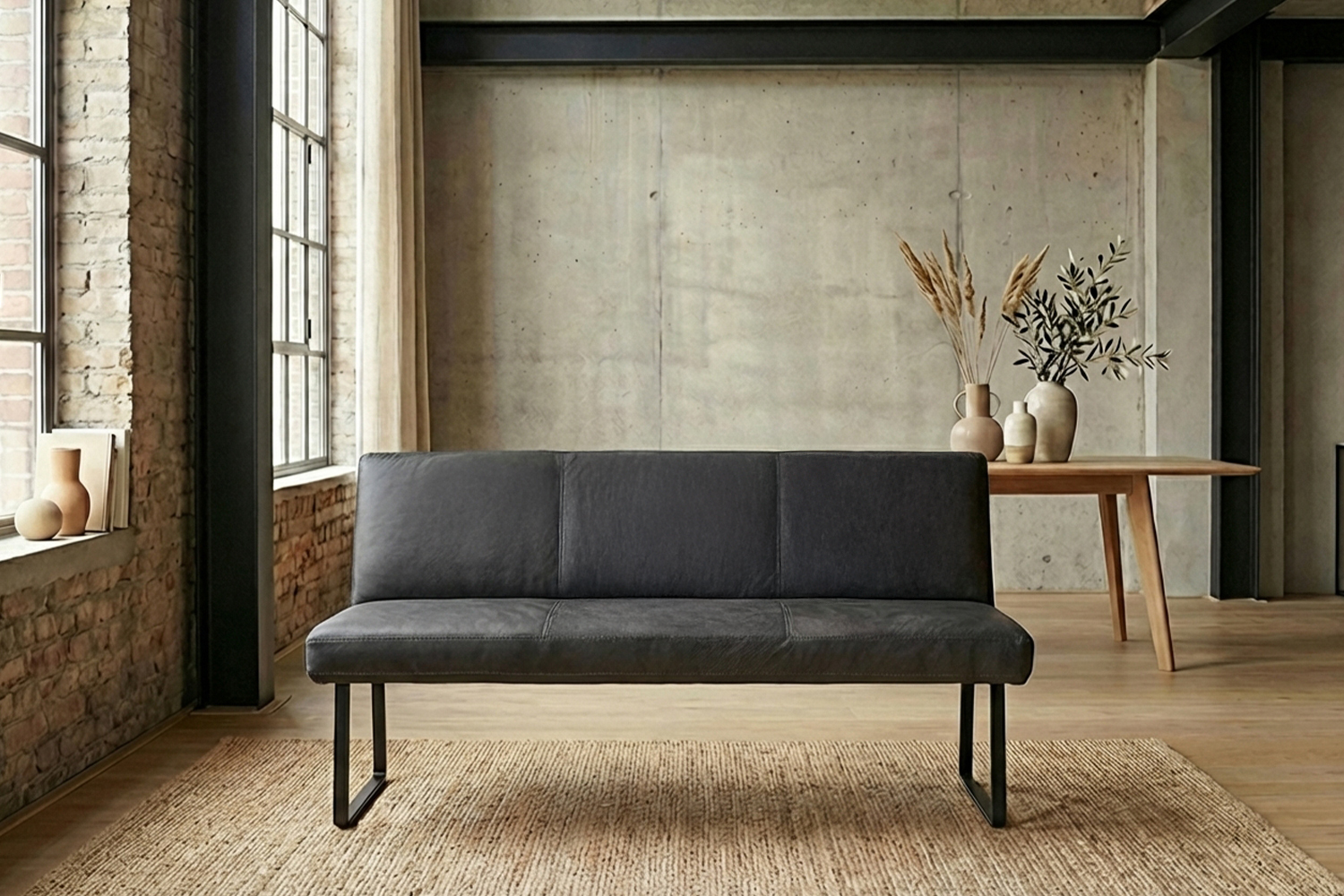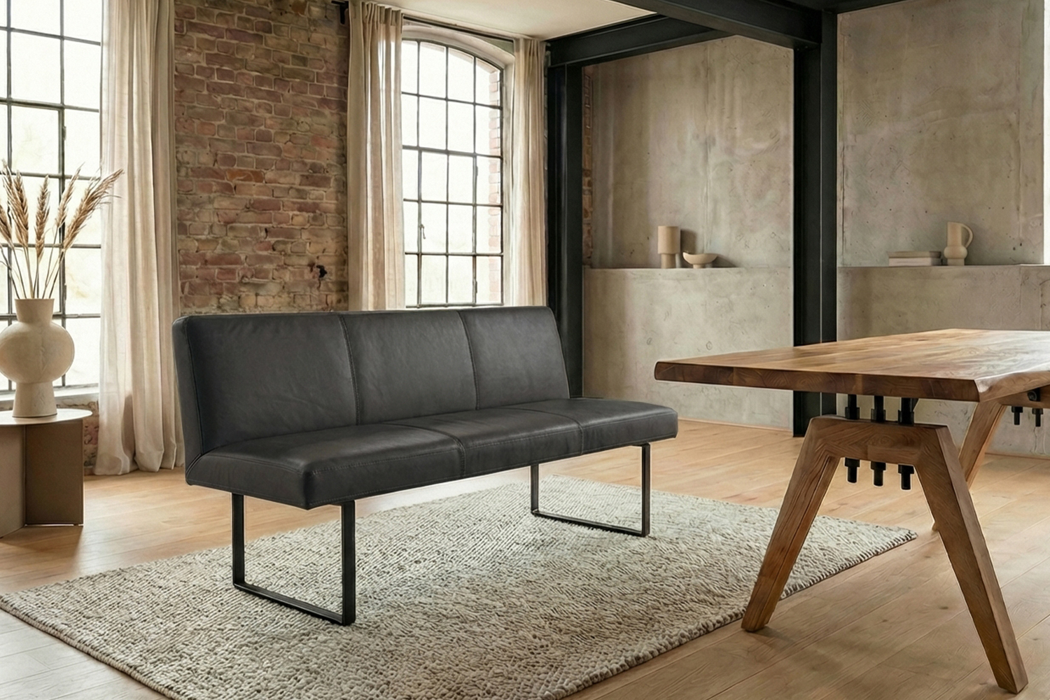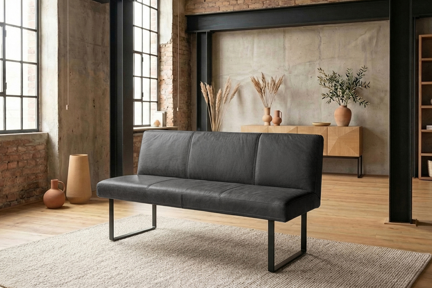 Das filigrane Gestell aus matt schwarzem Metall sorgt für einen sicheren Stand und unterstreicht den modernen Charakter der Bank. Im Inneren garantiert ein stabiler Massivholzrahmen langlebige Qualität und hohe Belastbarkeit. Für exzellenten Sitzkomfort ist ELEEN mit einem hochwertigen Sitzaufbau ausgestattet: PUR-Schaum in Kombination mit einem punktelastischen Tonnentaschenfederkernsitz mit gezogenem Federstahldraht sorgt für optimale Druckverteilung und komfortables Sitzen – auch über längere Zeit hinweg.