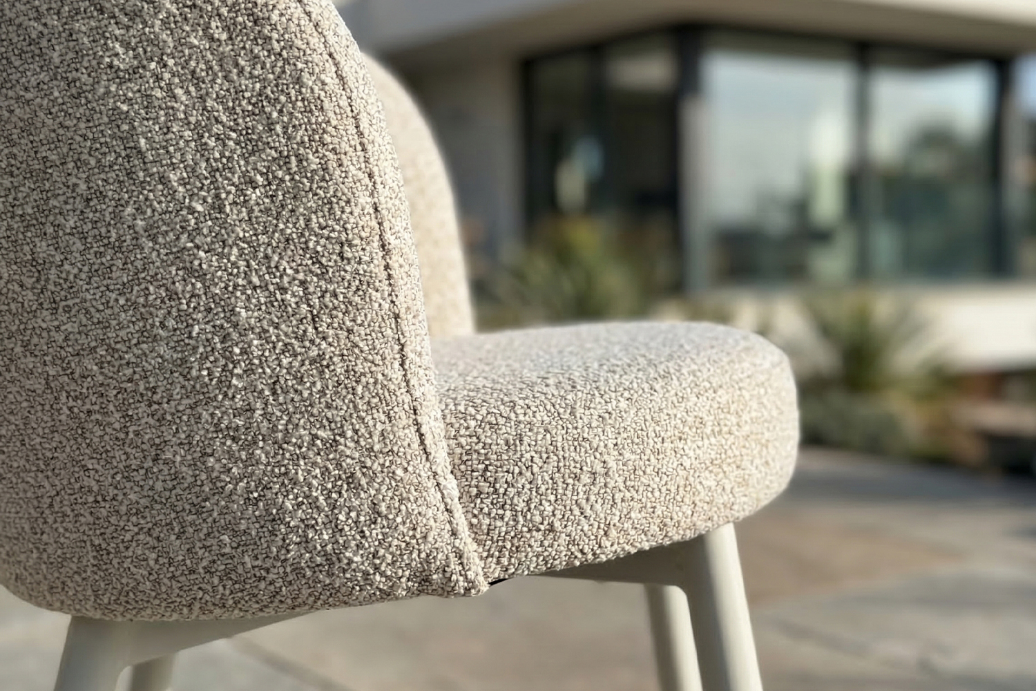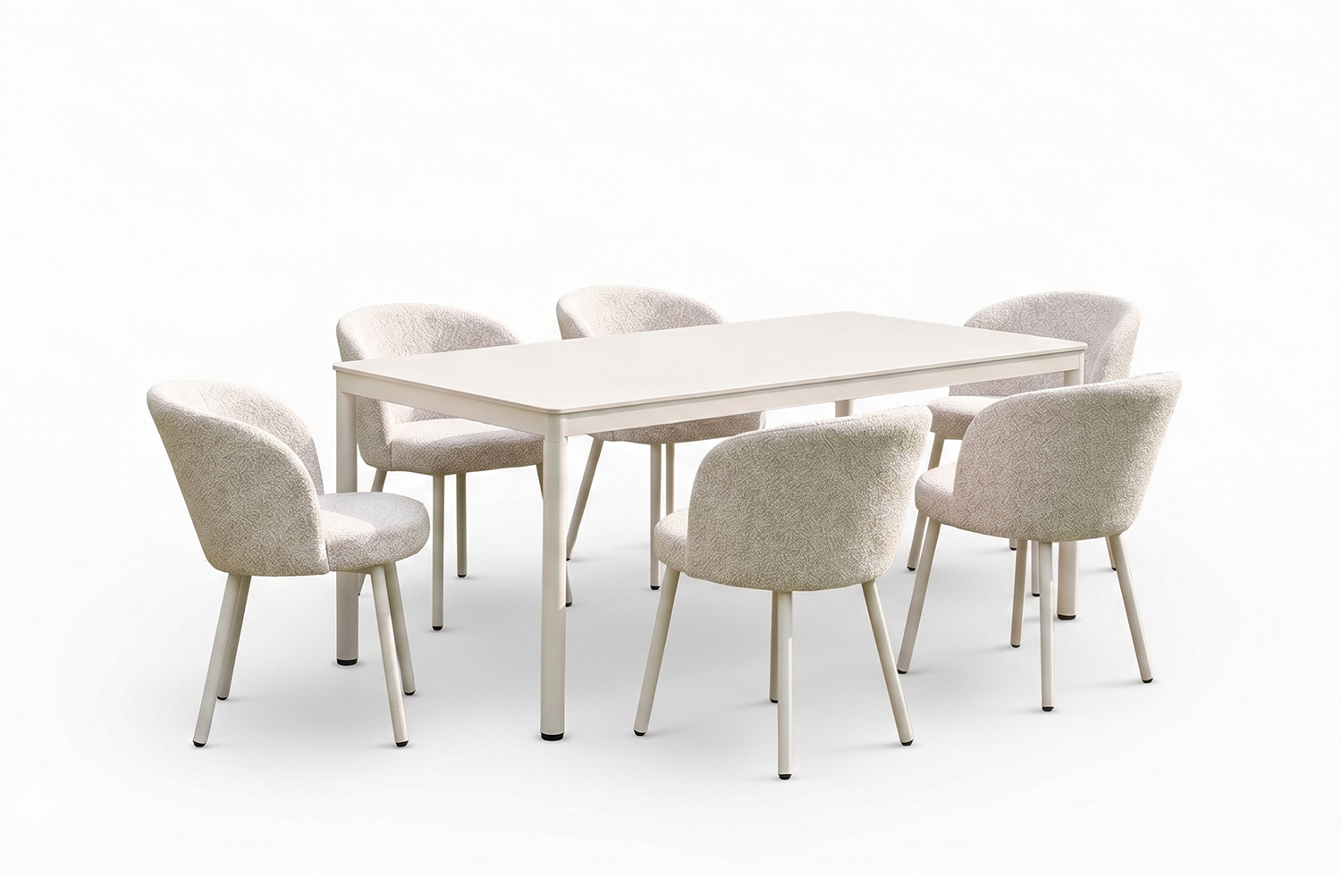 Ergänzt wird das Set durch sechs Gartenstühle INDUS, die modernes Design mit funktionaler Stabilität verbinden. Die Stühle sind robust verarbeitet, wasserabweisend und für den Einsatz im Außenbereich konzipiert. Sie bieten angenehmen Sitzkomfort und fügen sich harmonisch in das Gesamtbild der Essgruppe ein.