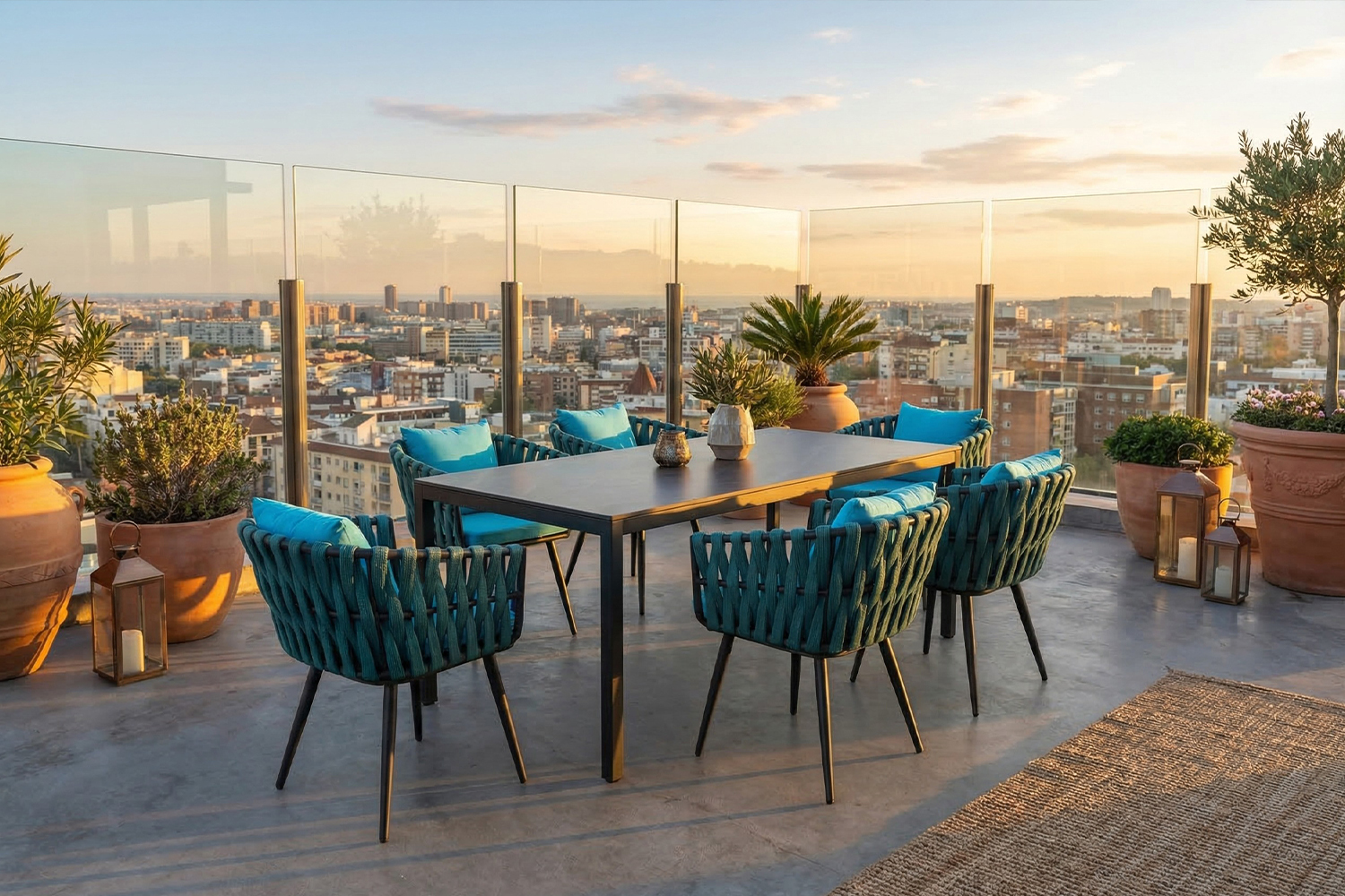 Auch die Stühle sind wasserabweisend, wetterfest und für den ganzjährigen Einsatz im Außenbereich konzipiert. So entsteht ein harmonisches Gesamtbild, das Design und Funktionalität perfekt vereint.