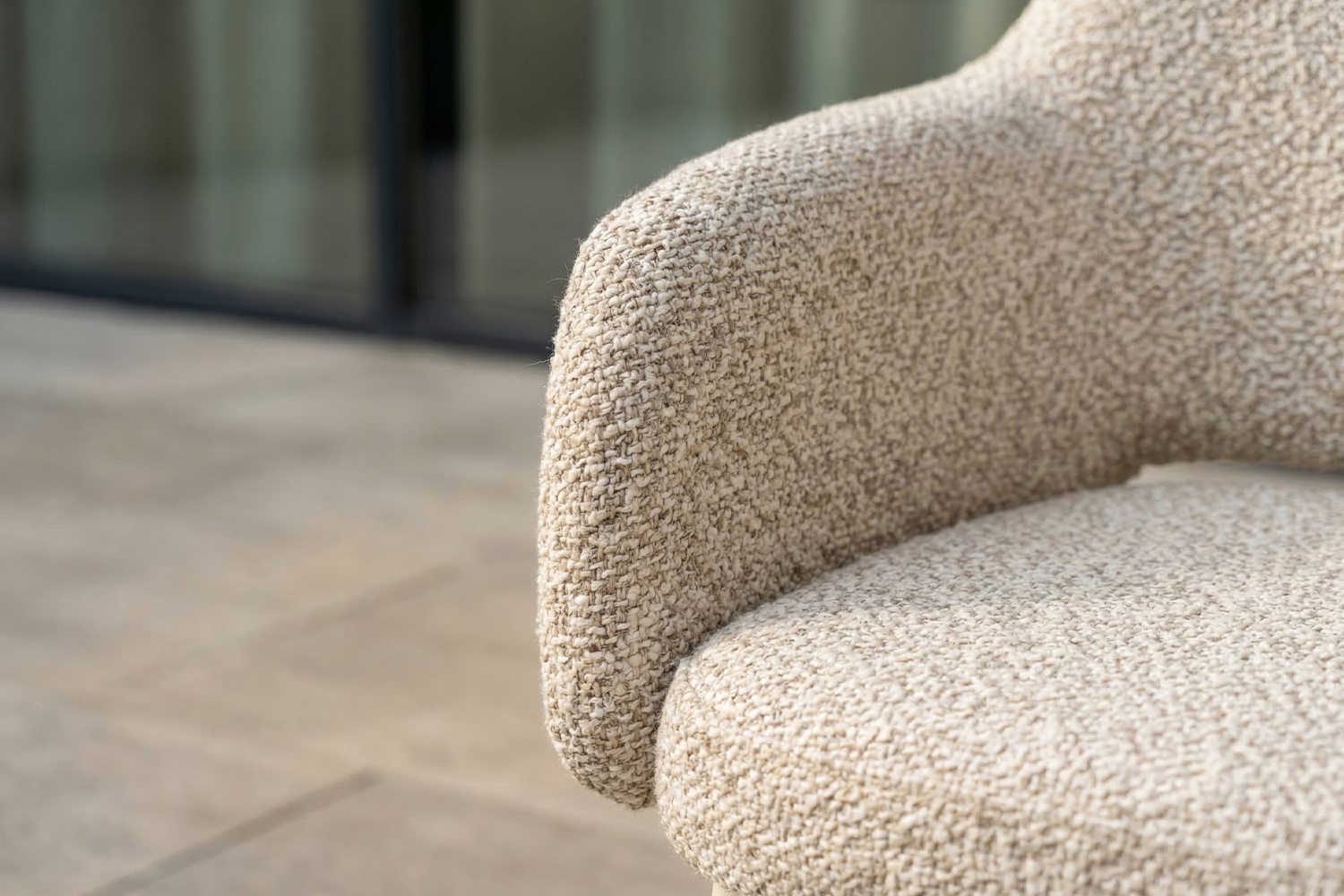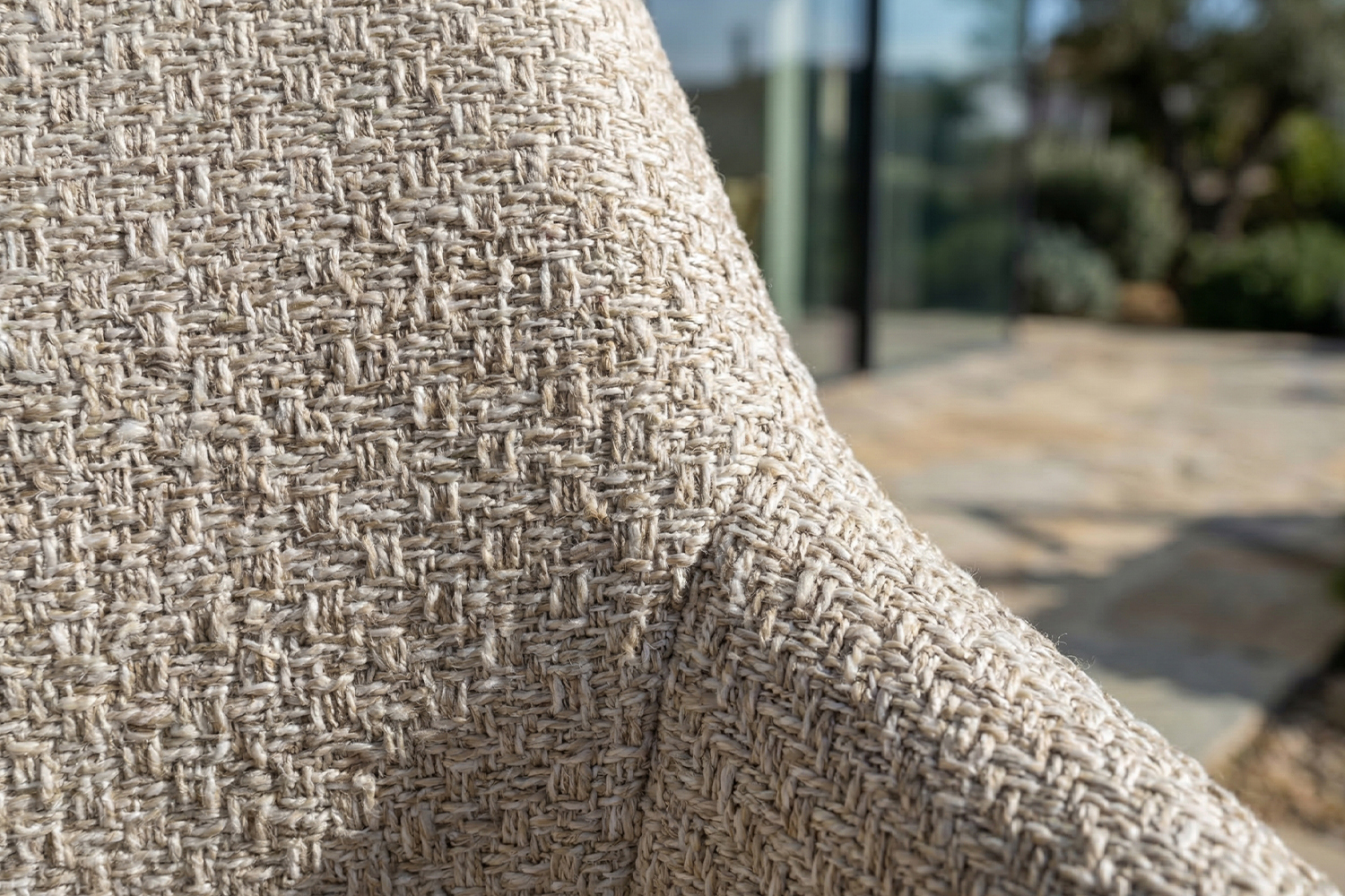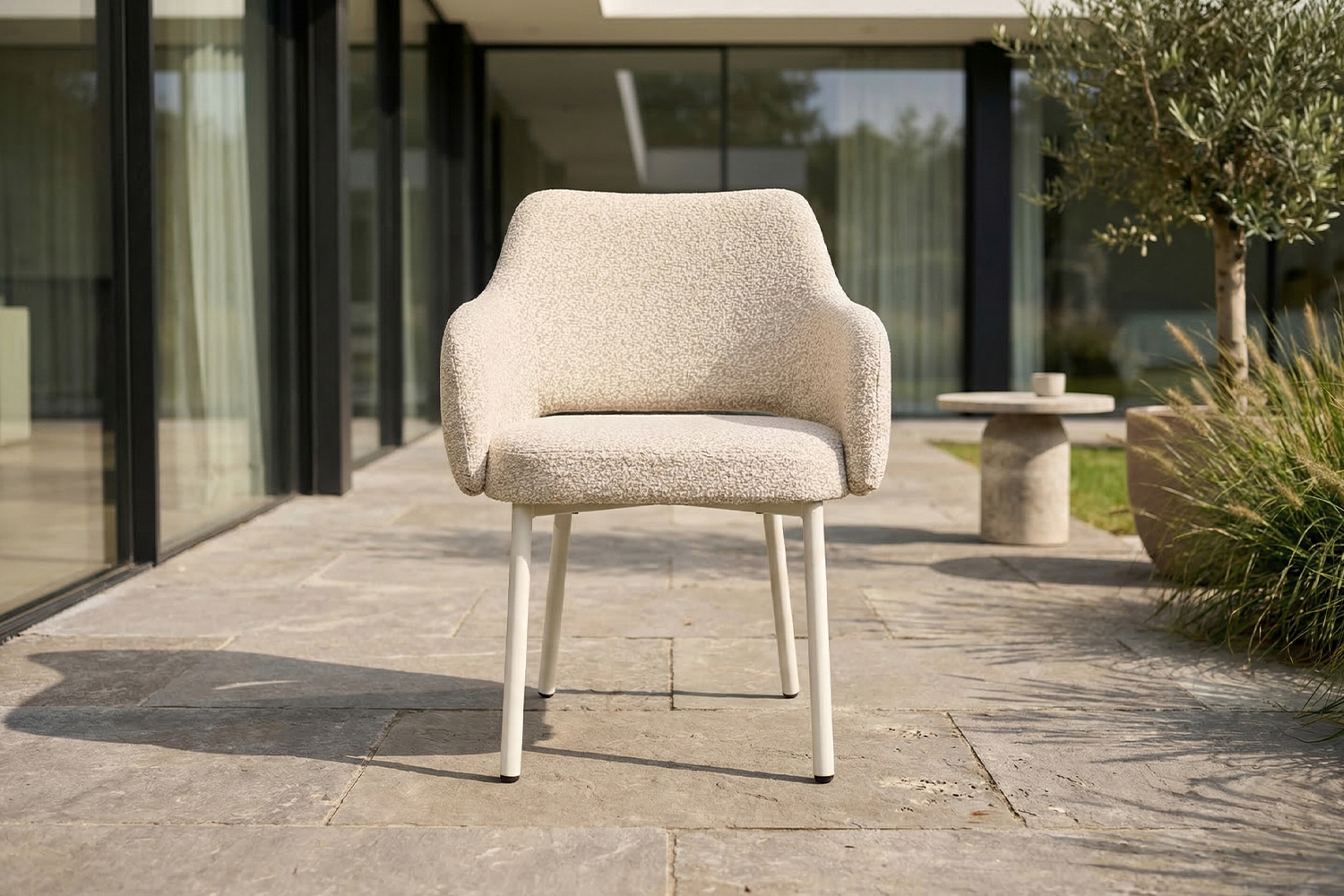 Der Gartenstuhl AMUR von KAWOLA vereint modernes Design mit hochwertiger Verarbeitung und ist die perfekte Wahl für stilvolle Outdoor-Bereiche. Mit seiner weich gepolsterten Sitzschale und den harmonisch integrierten Armlehnen bietet er ein besonders angenehmes Sitzgefühl und lädt zu entspannten Stunden auf Terrasse, Balkon oder im Garten ein.