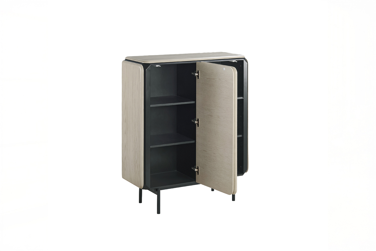 Das Highboard AVRIL von KAWOLA überzeugt durch seine klare, moderne Linienführung und eine elegante, grifflose Frontgestaltung. Die sanft gerundeten Seiten verleihen dem Möbelstück eine weiche, harmonische Ausstrahlung, während das schlanke, pulverbeschichtete Metallgestell für Stabilität und eine zeitgemäße Leichtigkeit sorgt. Korpus und Türen bestehen aus MDF mit hochwertigem Eiche-Furnier und unterstreichen den natürlichen, hochwertigen Charakter des Designs.