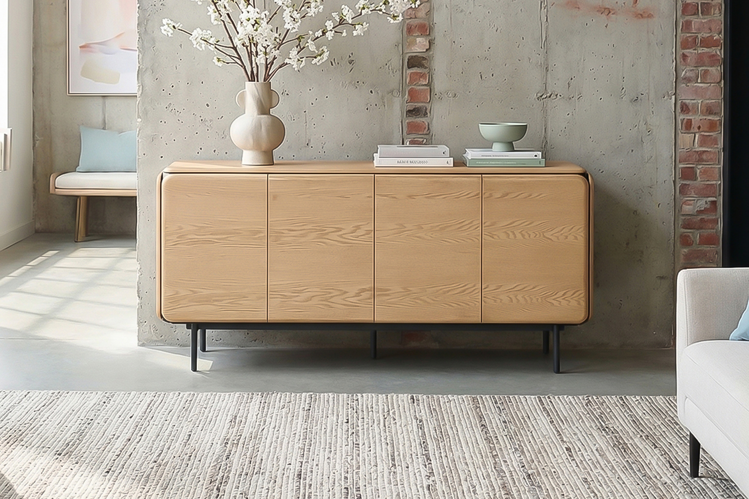Das Sideboard AVRIL von KAWOLA überzeugt durch seine klare Formensprache und eine harmonische Kombination aus moderner Eleganz und funktionaler Raffinesse. Die grifflose Front mit vier Türen wirkt ruhig und hochwertig, während die sanft gerundeten Seiten dem Möbelstück eine weiche, stilvolle Ausstrahlung verleihen. Korpus und Türen bestehen aus MDF mit edlem Eiche-Furnier und unterstreichen den natürlichen Charakter des Designs. Das schlanke, pulverbeschichtete Metallgestell sorgt für Stabilität und verleiht dem Sideboard eine leichte, zeitgemäße Optik.