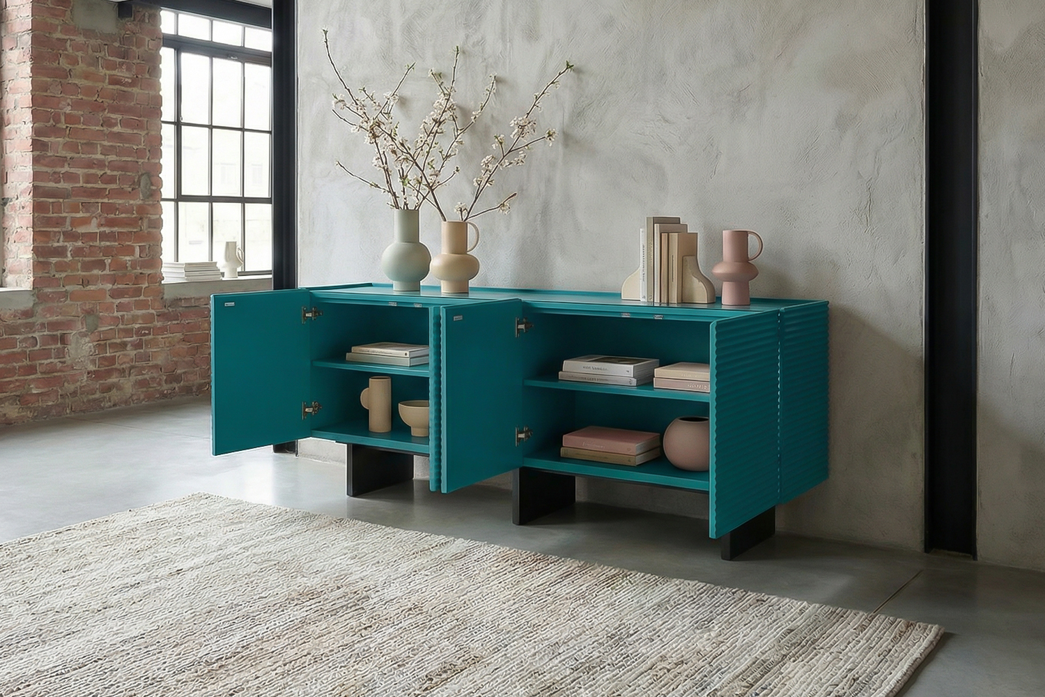 Hinter vier Türen bietet LYNN großzügigen Stauraum mit insgesamt vier Fächern. Die Einlegeböden lassen sich flexibel in drei verschiedenen Höhen einsetzen, jeweils mit einem Abstand von 7 cm, sodass Sie den Innenraum individuell an Ihre Bedürfnisse anpassen können. Der integrierte Finger-Pull-Mechanismus ermöglicht ein komfortables Öffnen, während Soft-Close-Scharniere für ein sanftes und geräuschloses Schließen sorgen. So verbindet das Sideboard außergewöhnliche Optik mit durchdachter Funktionalität.