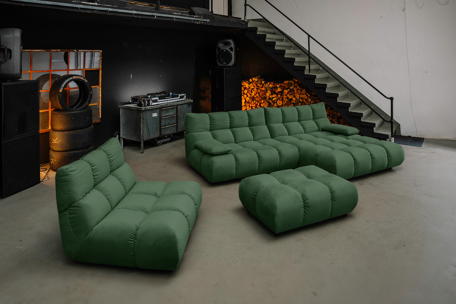 Der Bezug aus edlem Velvet verleiht der Sitzgruppe eine elegante Note. Die samtweiche Oberfläche und der feine Glanz machen jedes Möbelstück zum Blickfang und schaffen ein luxuriöses Ambiente.