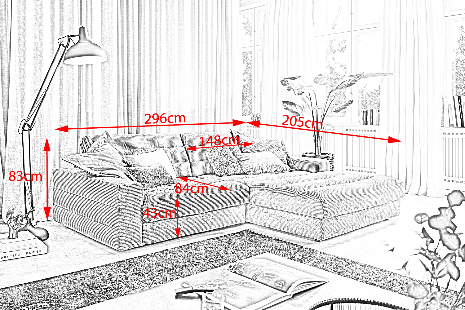 - Tiefe Longchair: 205 cm