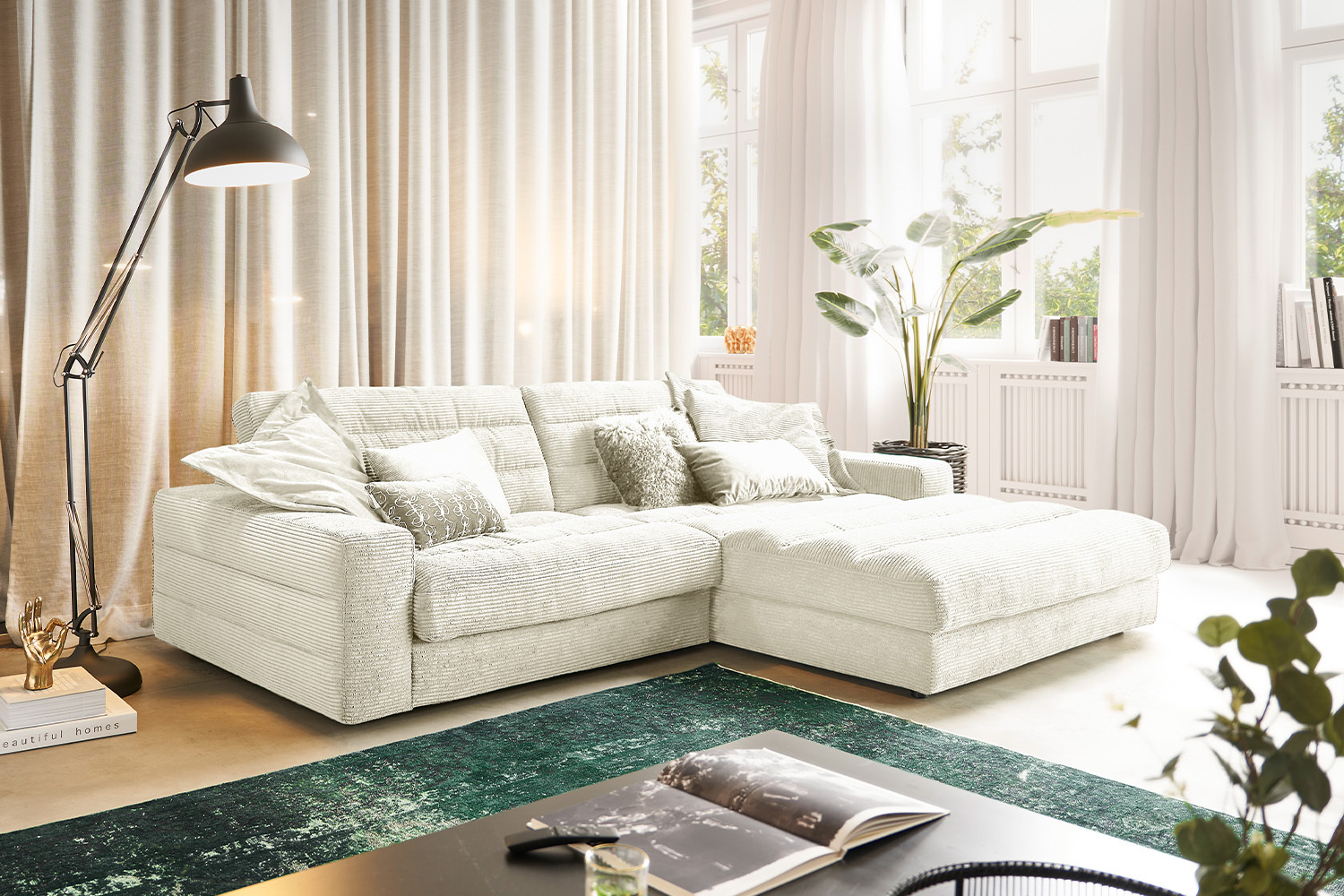 Bezug aus angesagtem Cord-Stoff Gestell: tragende Teile aus Massivholz und Holzwerkstoffen Sitz: Unterfederung mit dauerelastischen Stahl-Wellenfedern und einer oberseitigen Abdeckung; Sitz aus PUR-Schaum Sitzkomfort: weicher und legerer Polsteraufbau; die Polsterung passt sich der Körperform an; Sitzabdrücke sowie Wellenbildung der Bezüge sind warentypisch Sitz und Rücken sind abgedeckt mit einem Inlett, welches befüllt ist mit hochwertigen Füllstoffen, die eine Beimischung von Federn enthalten. Fußvariante: Gleitfuß (Höhe: 5 cm) Breite Armlehne: 28 cm Sitzbreite: 240 cm Tiefe 1,5-Sitzer: 125 cm / Breite 1,5-Sitzer: 148 cm / Sitzbreite 1,5-Sitzer: 120 cm Breite Recamiere: 148 cm / Sitztiefe Recamiere: 164 cm / Sitzbreite Recamiere: 120 cm