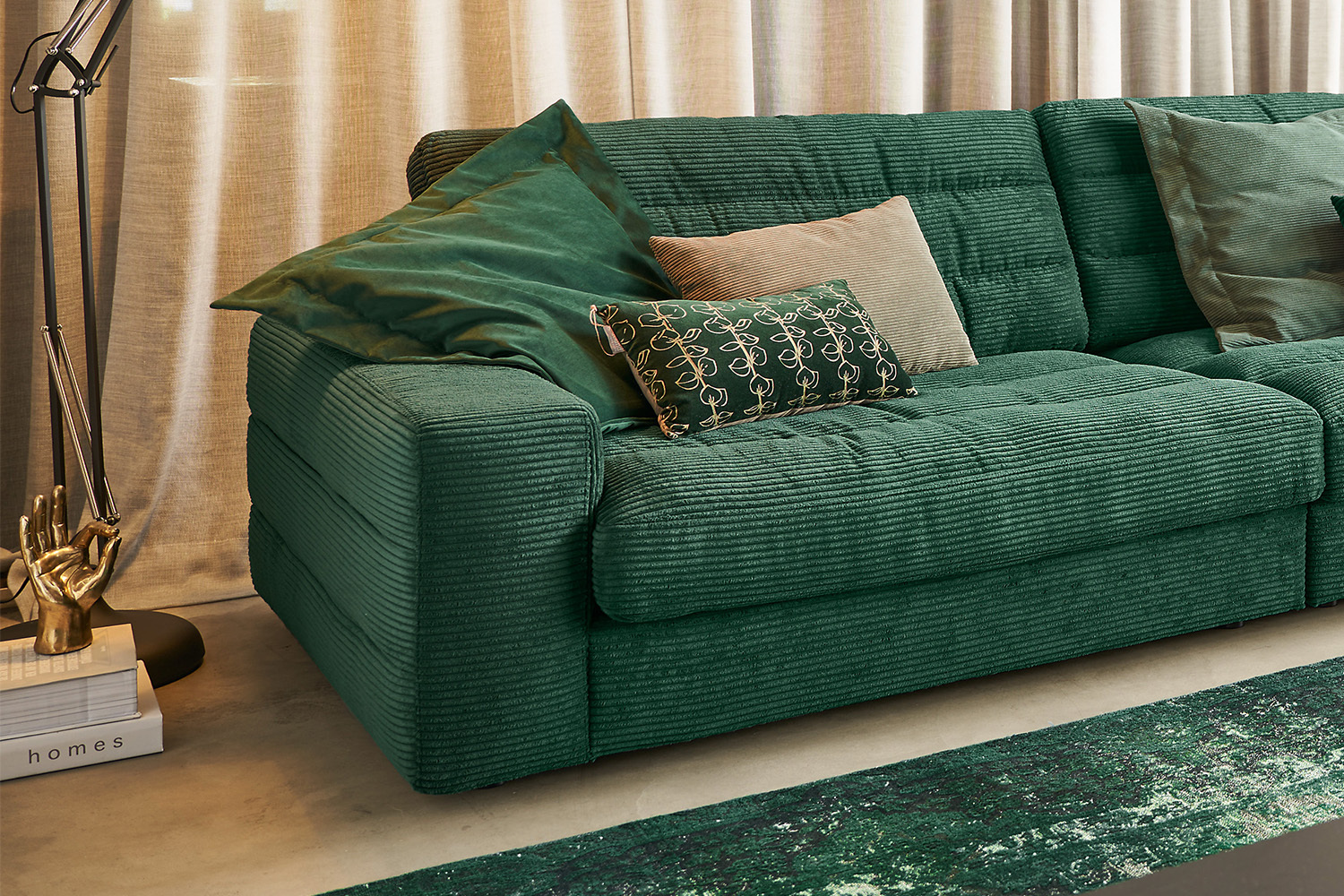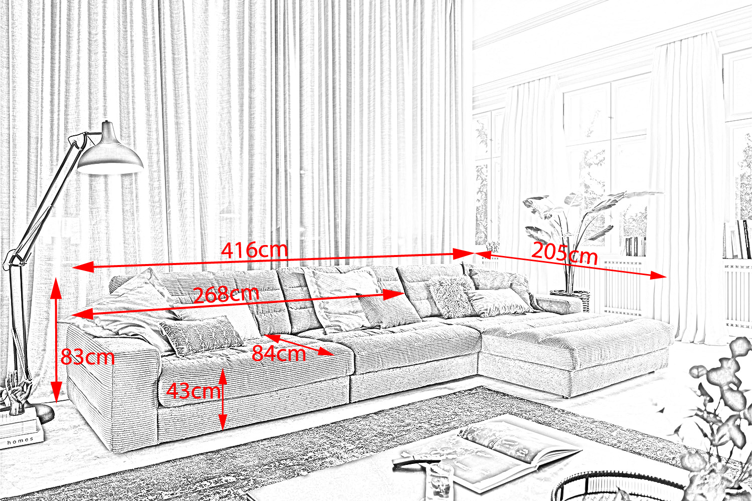 Bezug aus angesagtem Cord-Stoff   Gestell: tragende Teile aus Massivholz und Holzwerkstoffen    Sitz: Unterfederung mit dauerelastischen Stahl-Wellenfedern und einer oberseitigen Abdeckung; Sitz aus PUR-Schaum   Sitzkomfort: weicher und legerer Polsteraufbau; die Polsterung passt sich der Körperform an; Sitzabdrücke sowie Wellenbildung der Bezüge sind warentypisch    Sitz und Rücken sind abgedeckt mit einem Inlett, welches befüllt ist mit hochwertigen Füllstoffen, die eine Beimischung von Federn enthalten.   Fußvariante: Gleitfuß (Höhe: 5 cm)    Breite Armlehne: 28 cm   Sitzbreite: 360 cm   Tiefe 3-Sitzer: 125 cm / Breite 3-Sitzer: 268 cm / Sitzbreite 3-Sitzer: 240 cm    Breite Recamiere: 148 cm / Sitztiefe Recamiere: 164 cm / Sitzbreite Recamiere: 120 cm