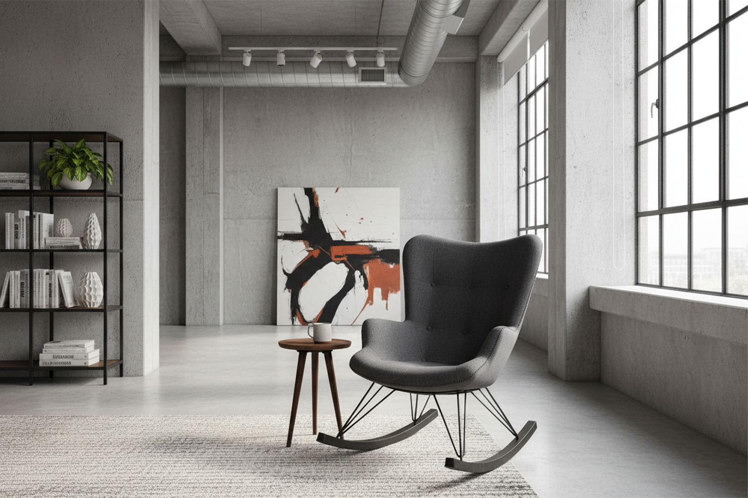 Hier erscheint der Schaukelstuhl in einem modernen Design und vereint Bequemlichkeit mit modernem Stilbewusstsein.
